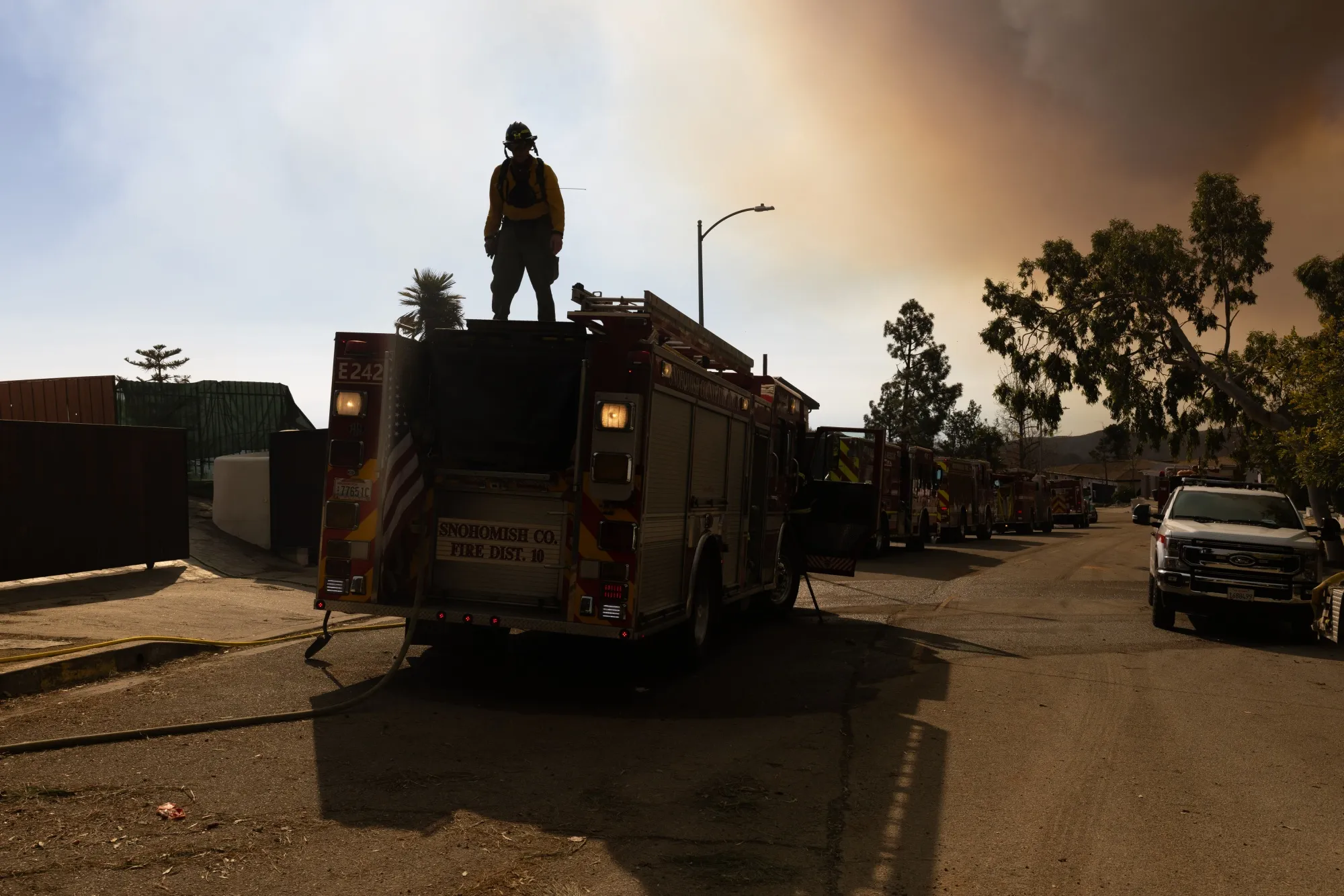 一名消防员在洛杉矶苏利文峡谷地区的帕利塞德火灾期间在一辆卡车顶部工作,时间是1月11日。