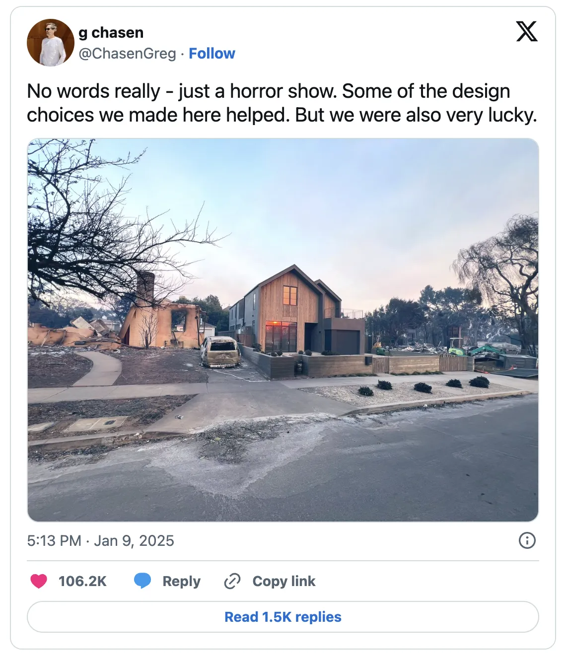 在洛杉矶,正在进行的火灾已造成至少24人死亡,还烧毁了数千栋建筑,沿途仅剩下少数几栋仍然屹立。在太平洋帕利塞德的一条火灾肆虐的街道上,一栋房屋独自完好无损:这栋新建的房子是用经过热处理的木材和金属屋顶建造的,周围用混凝土花园墙围起来。