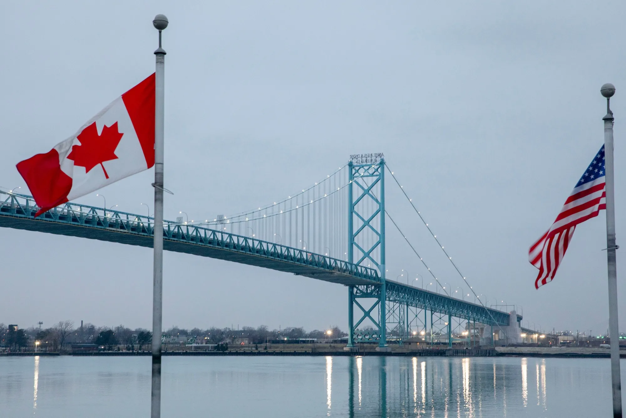 加拿大和美国国旗在安大略省温莎的加拿大-美国边界的安大使桥附近。