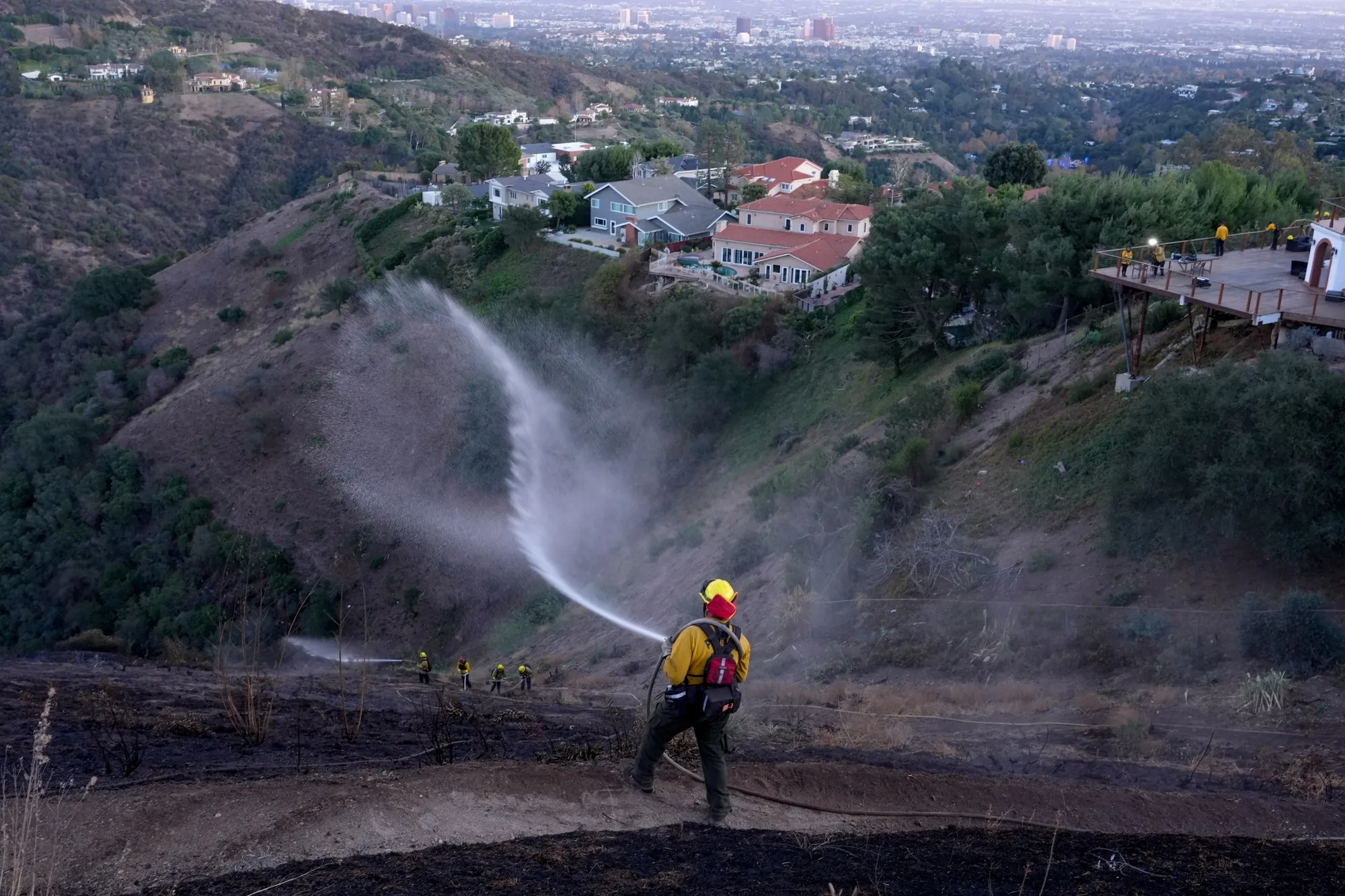 消防员在洛杉矶的曼德维尔峡谷社区喷洒水以扑灭烧焦的山坡