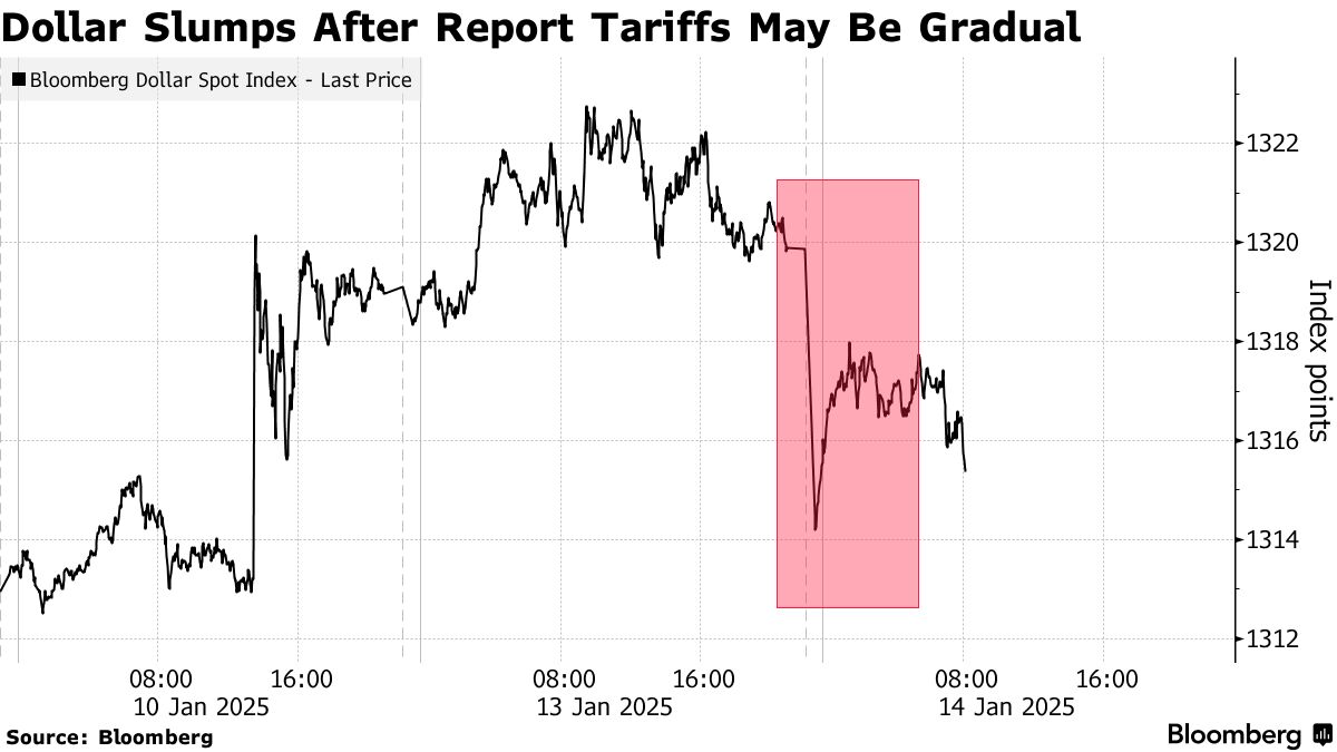 关税报告使美元指数在连续五天上涨后下跌,全球债券市场在近期借贷成本急剧上升后趋于稳定。十年期国债收益率在周一触及2023年10月高点后下滑约一个基点,此举是由于交易员削减了对美联储降息的押注。近期受到重创的英国国债也暂停了抛售。