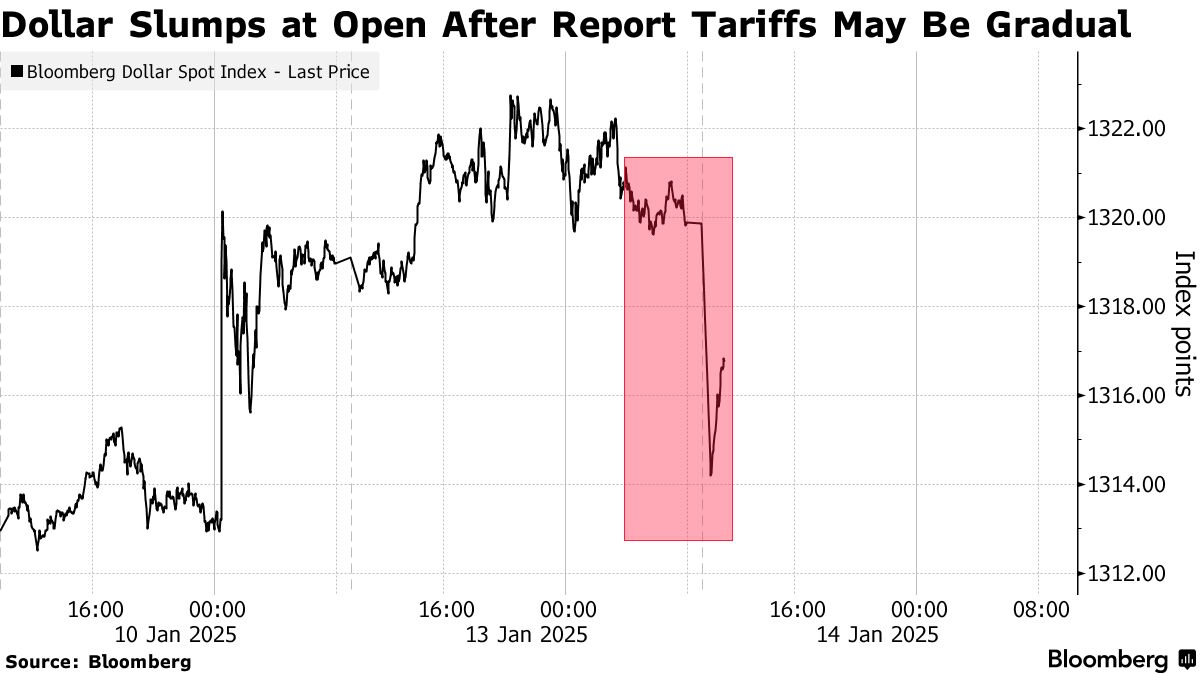 彭博美元现货指数在周二早盘亚洲交易中下跌了多达0.4%,在一份报告中显示,特朗普的经济顾问正在讨论一种缓慢而稳定的关税方法,而不是一次性的大幅增加。这一举措可能会减缓关税带来的通胀压力,并可能为美联储降低利率提供更多的喘息空间。
