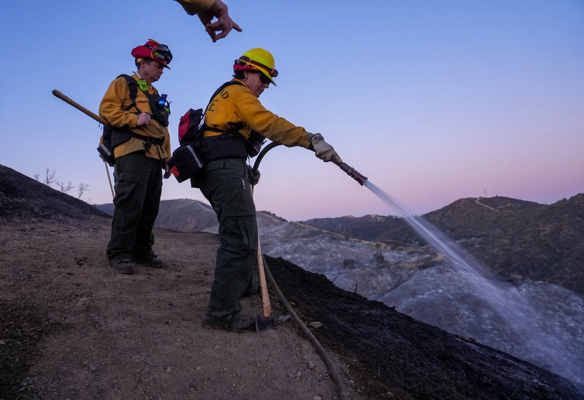 俄勒冈州的消防员在1月12日的帕利塞德火灾后向山坡喷洒水。
