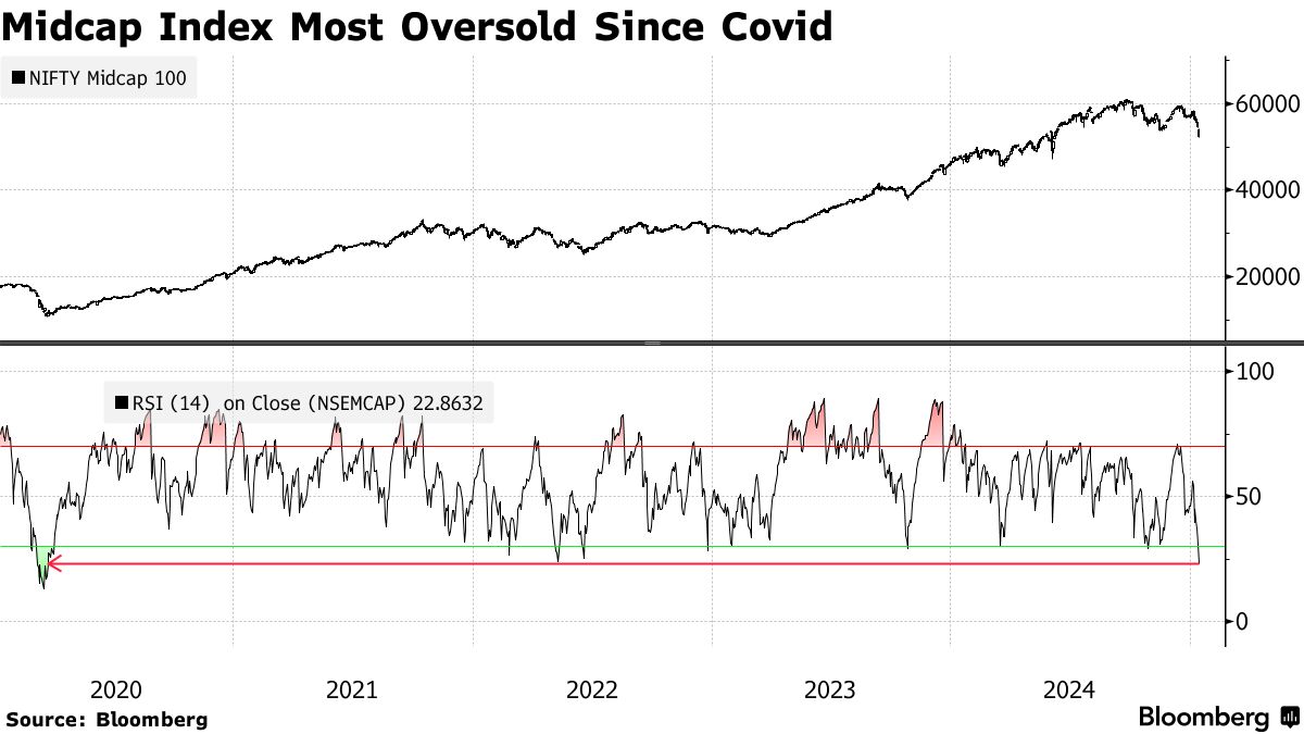 对于Nifty来说,这不仅仅是一个疯狂的星期一——它的兄弟,NSE Nifty Midcap 100,经历了更为艰难的旅程。该指标的14天相对强弱指数——一个动量指标——跌至自Covid-19疫情抛售以来的最超卖水平。中型股指标约占总市场价值的13%,反映了散户投资者的情绪。相对强弱指数的读数反映了极端悲观,这是由于对经济增长放缓和企业盈利疲软的担忧所推动的。