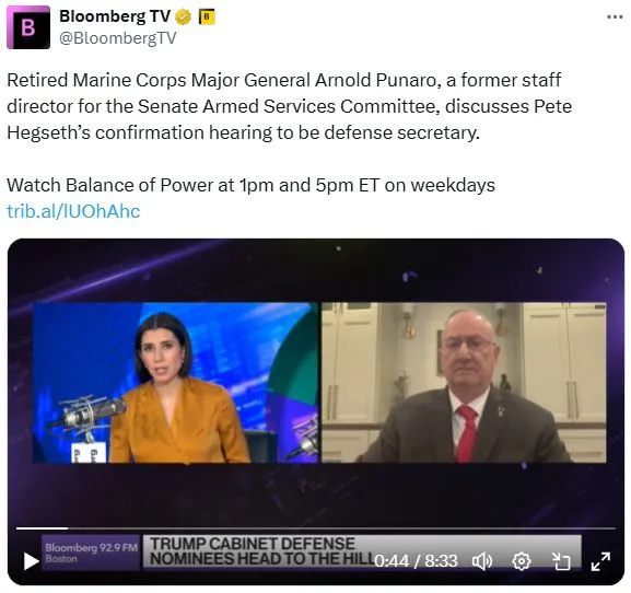 今天在彭博电视台的权力平衡早间版中,主持人乔·马修和凯莉·莱因兹采访了退役海军陆战队少将阿诺德·普纳罗,讨论赫格塞斯在参议院武装服务委员会确认听证会上的表现。