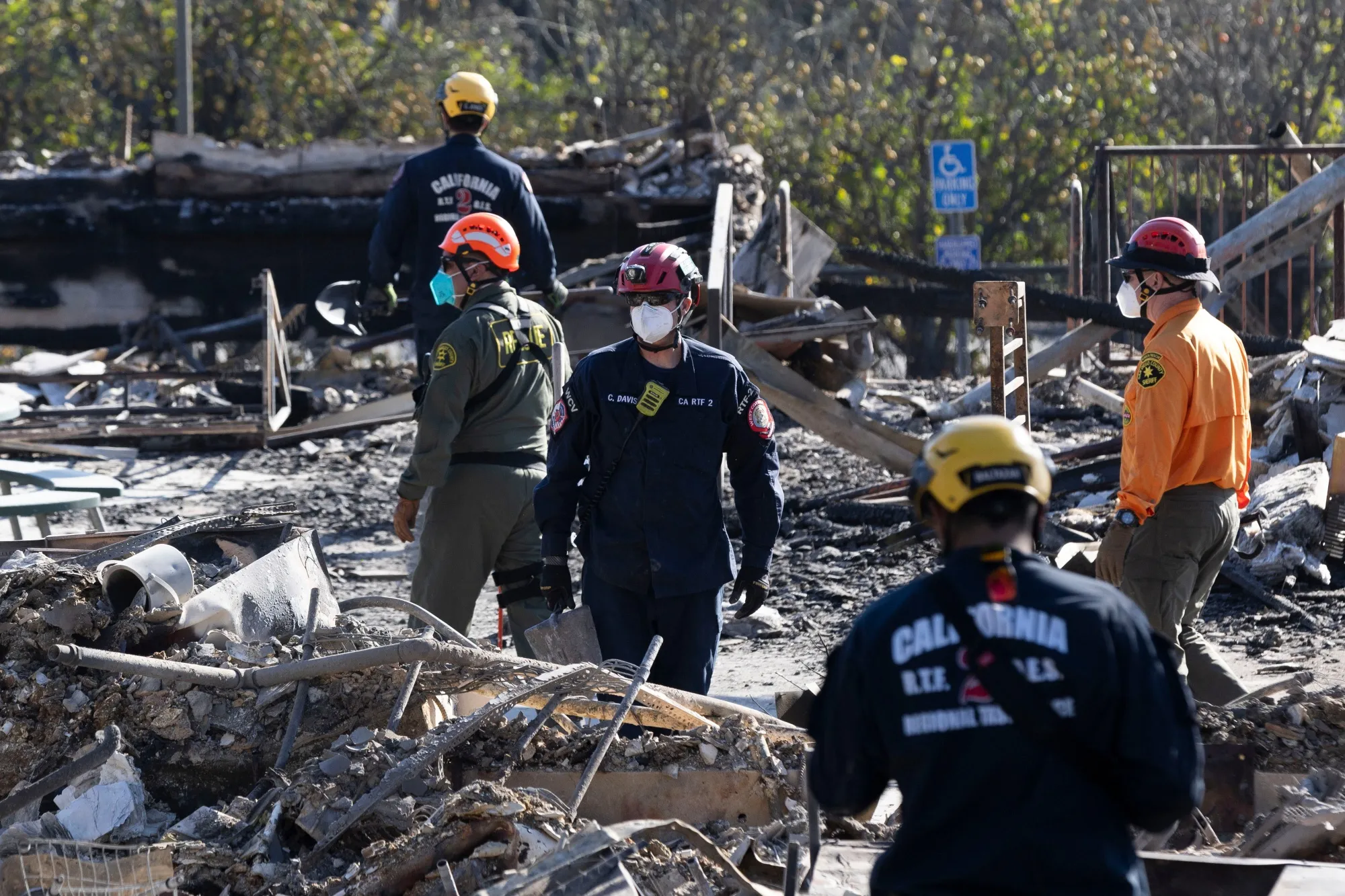 紧急救援人员在1月13日的阿尔塔迪纳伊顿火灾后进行工作。