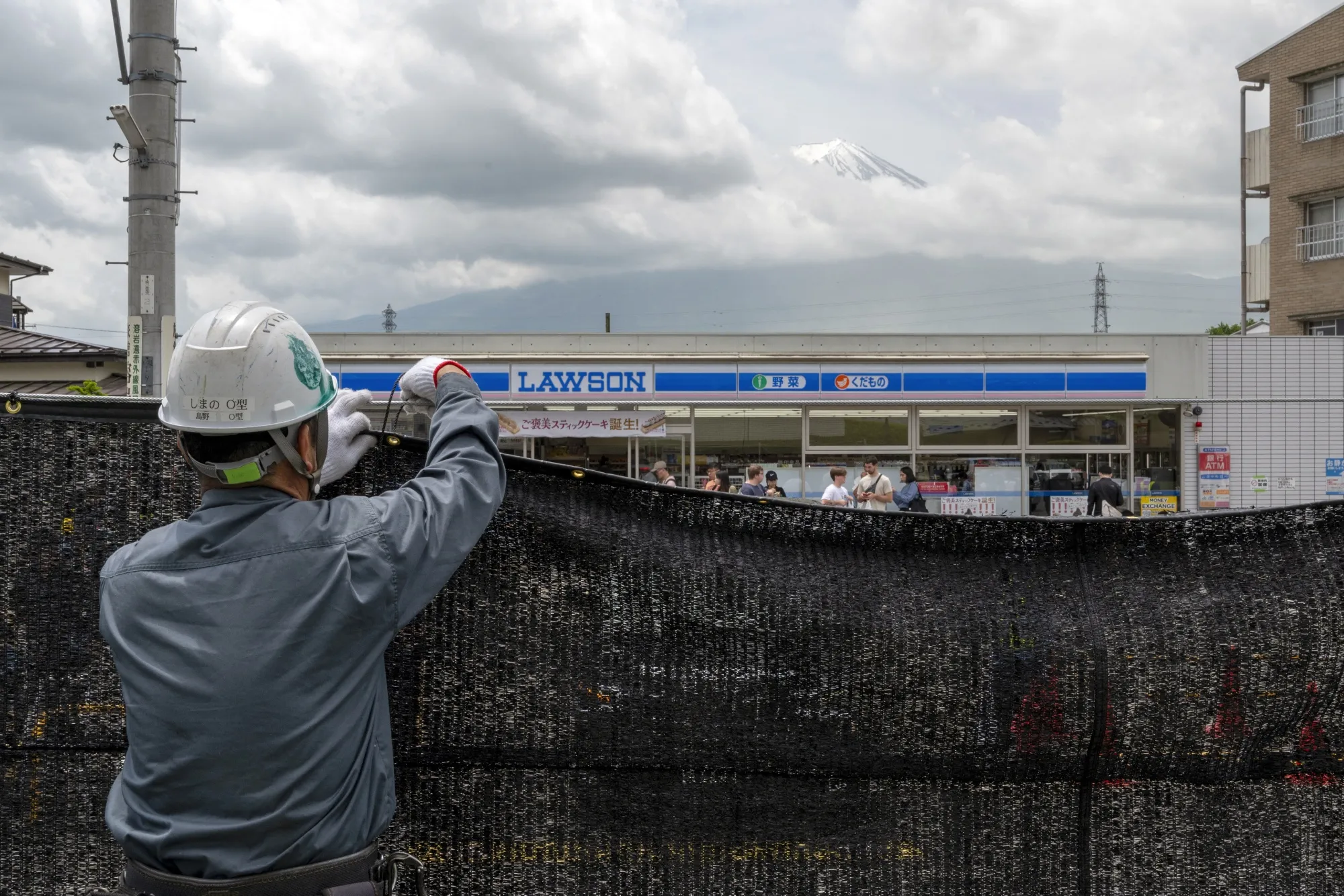 位于富士山郊区的度假小镇富士河口湖的地方当局,在一个受欢迎的社交媒体拍摄点竖起了一个障碍,以阻挡游客的涌入,该地点可以捕捉到地标似乎漂浮在便利店上方的景象,时间是在5月。