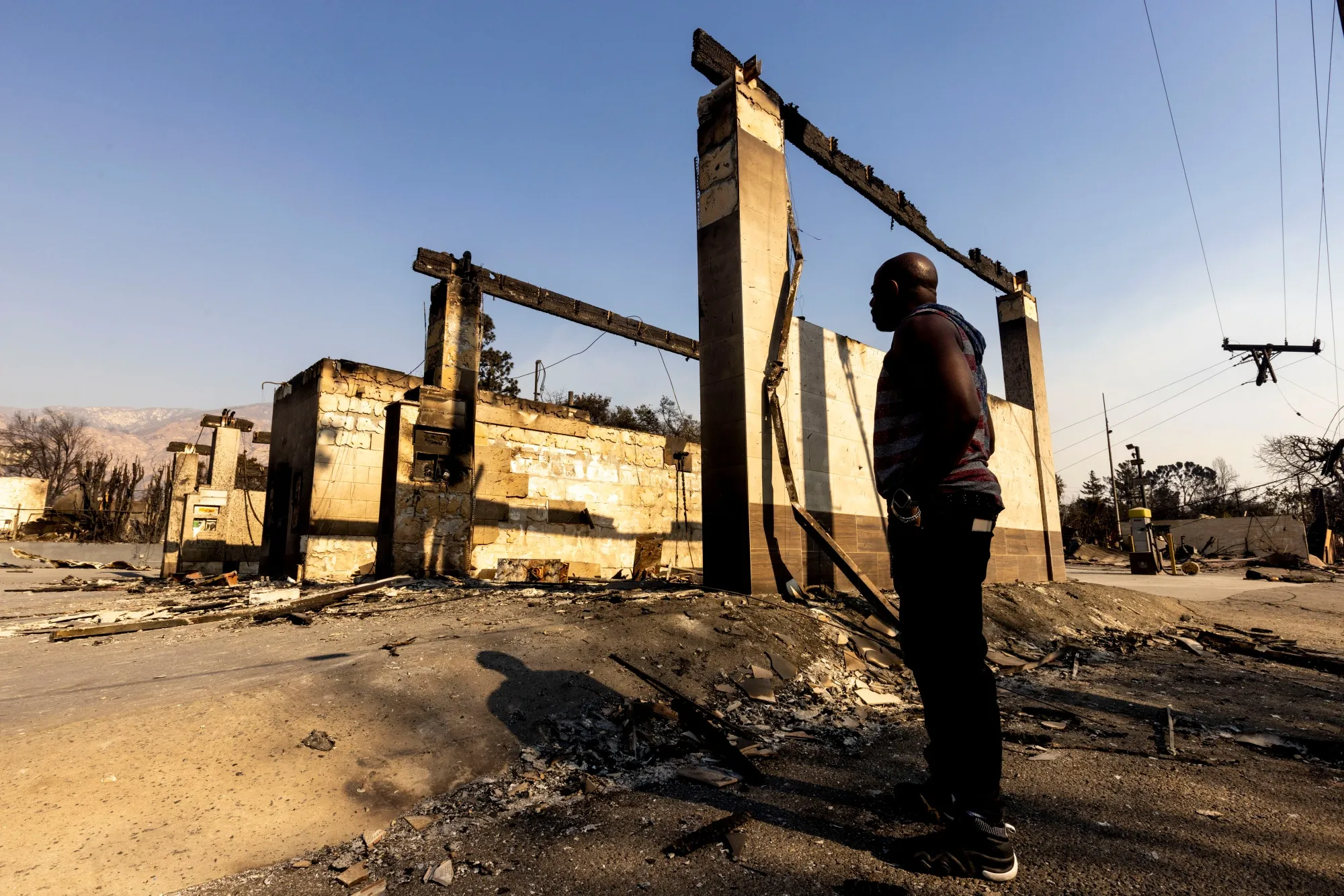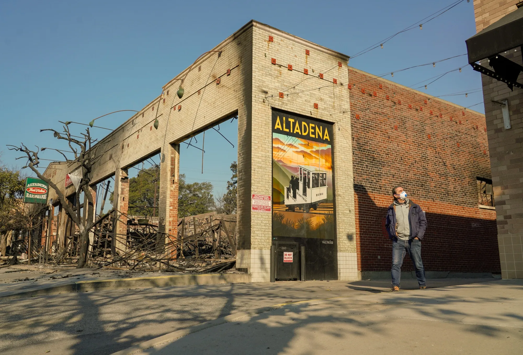 1月11日,阿尔塔迪纳一座被毁的商业建筑。摄影师:凯尔·格里洛特/彭博社“每个族裔和种族群体在美国都有自己的社区,而黑人,我们剩下的实在太少了——他们都被改造了,消失了,”黑人建筑师斯科特·艾伦·里弗斯说,他一直在努力重建洛杉矶地区被野火摧毁的房屋。