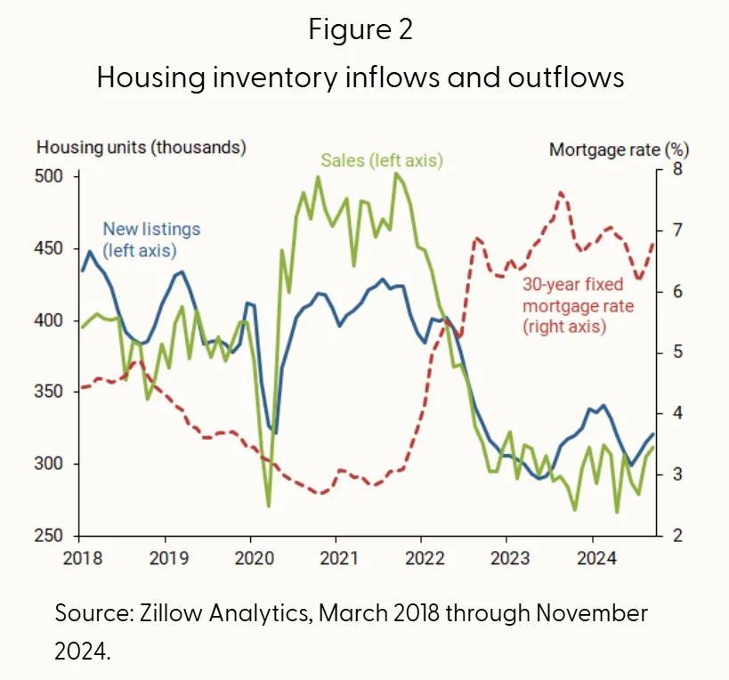 虽然自2022年以来上市数量有所下降,但受美联储影响的销售下滑也随之而来,帮助缓解了市场压力。三人得出的教训是,住房市场对抵押贷款利率的反应速度和敏感性。随着房贷利率仍接近7%,这提高了进一步美联储降息的风险。