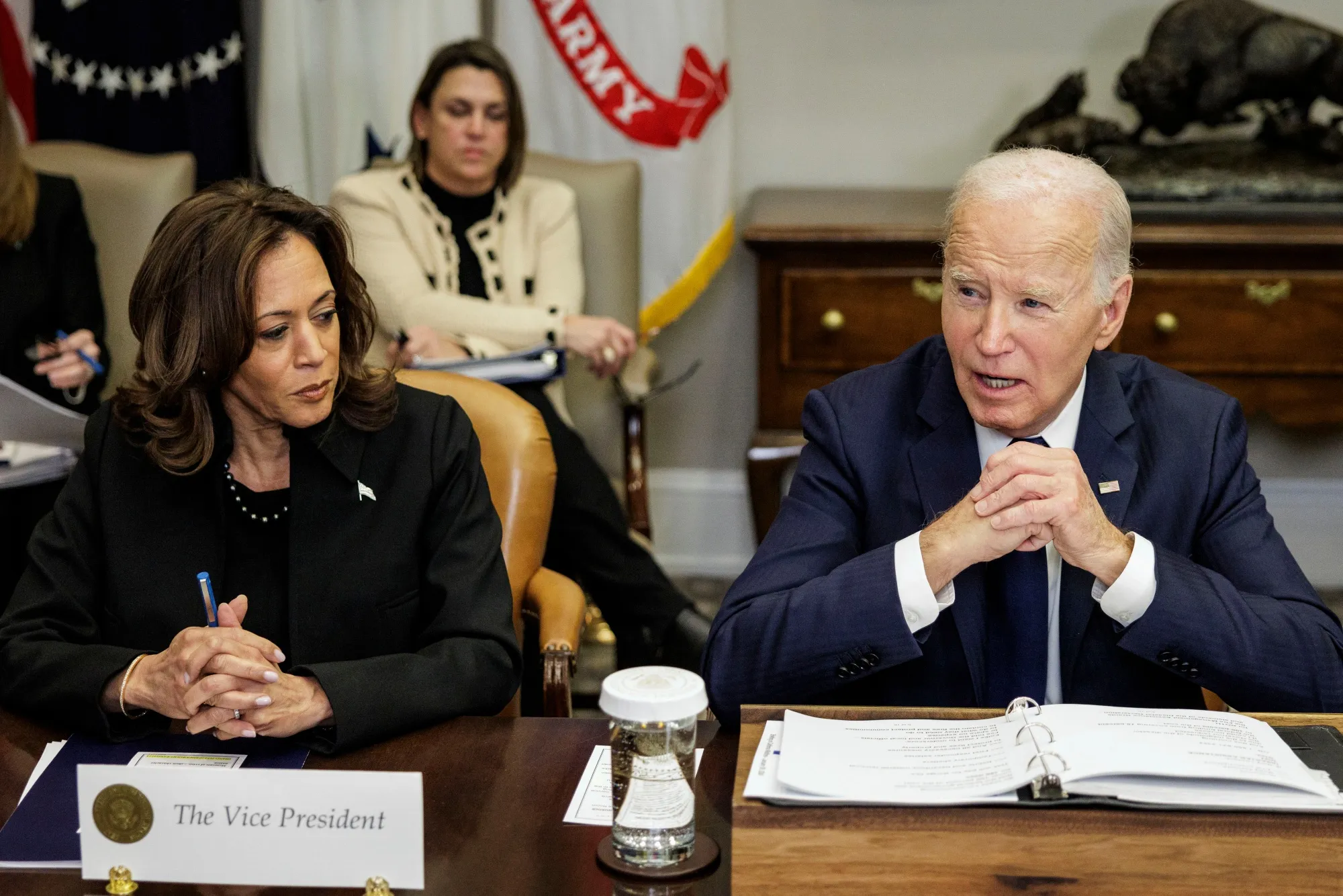 美国副总统卡马拉·哈里斯(左)和总统乔·拜登摄影师:Samuel Corum/Sipa/Bloomberg在一次关于火灾的白宫简报会上,拜登鼓励来宾“尽管问”他所点名的嘉宾。在哈里斯给了他一个眼神后,拜登补充道:“没有双关的意思。”