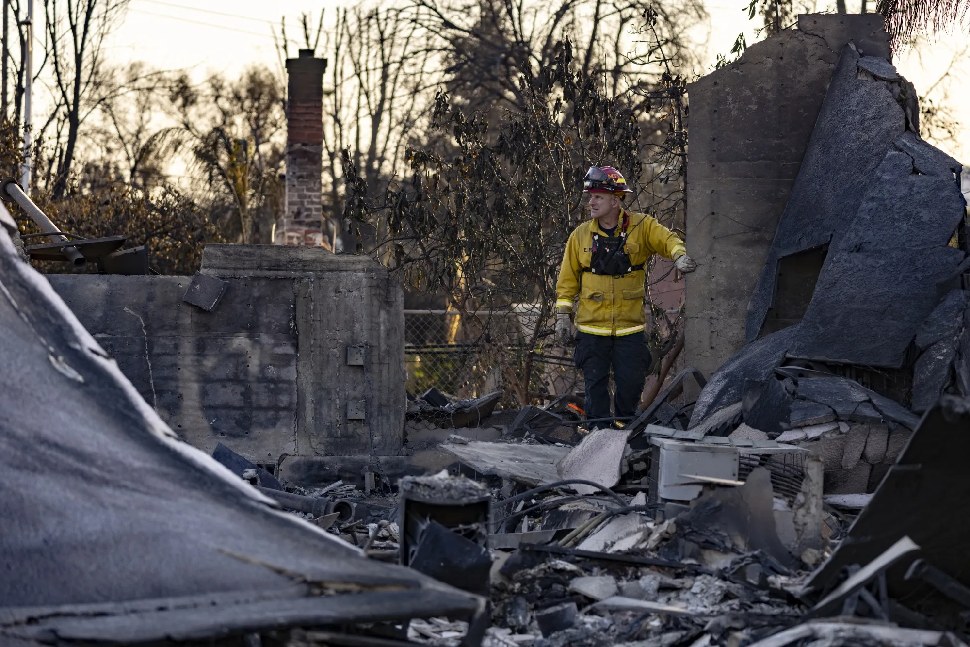 一名消防员在加利福尼亚州阿尔塔迪纳的伊顿火灾中走过被毁房屋的残骸,反应如常,时间是1月13日。