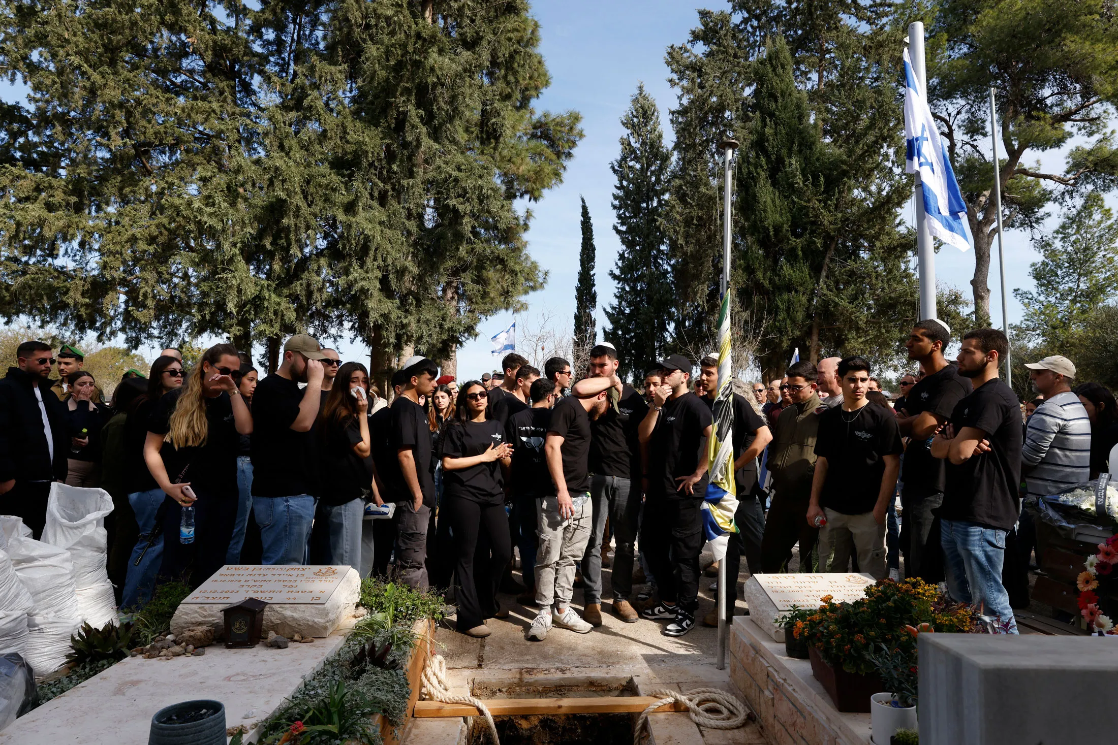 以色列军士雅哈夫·哈达尔的葬礼,他在加沙北部的冲突中被杀,葬礼于1月14日在以色列北部的卡法尔·塔沃尔镇举行。摄影师:贾拉·马雷/盖蒂图片社在这场战争中,已有超过400名士兵遇难,许多以色列人不再相信他们是在为政府承诺的可以赢得的事业而牺牲。他们担心在加沙的部队只是坐以待毙。没有任何公共活动——甚至许多私人活动——不提及迫切需要带回人质的心痛。