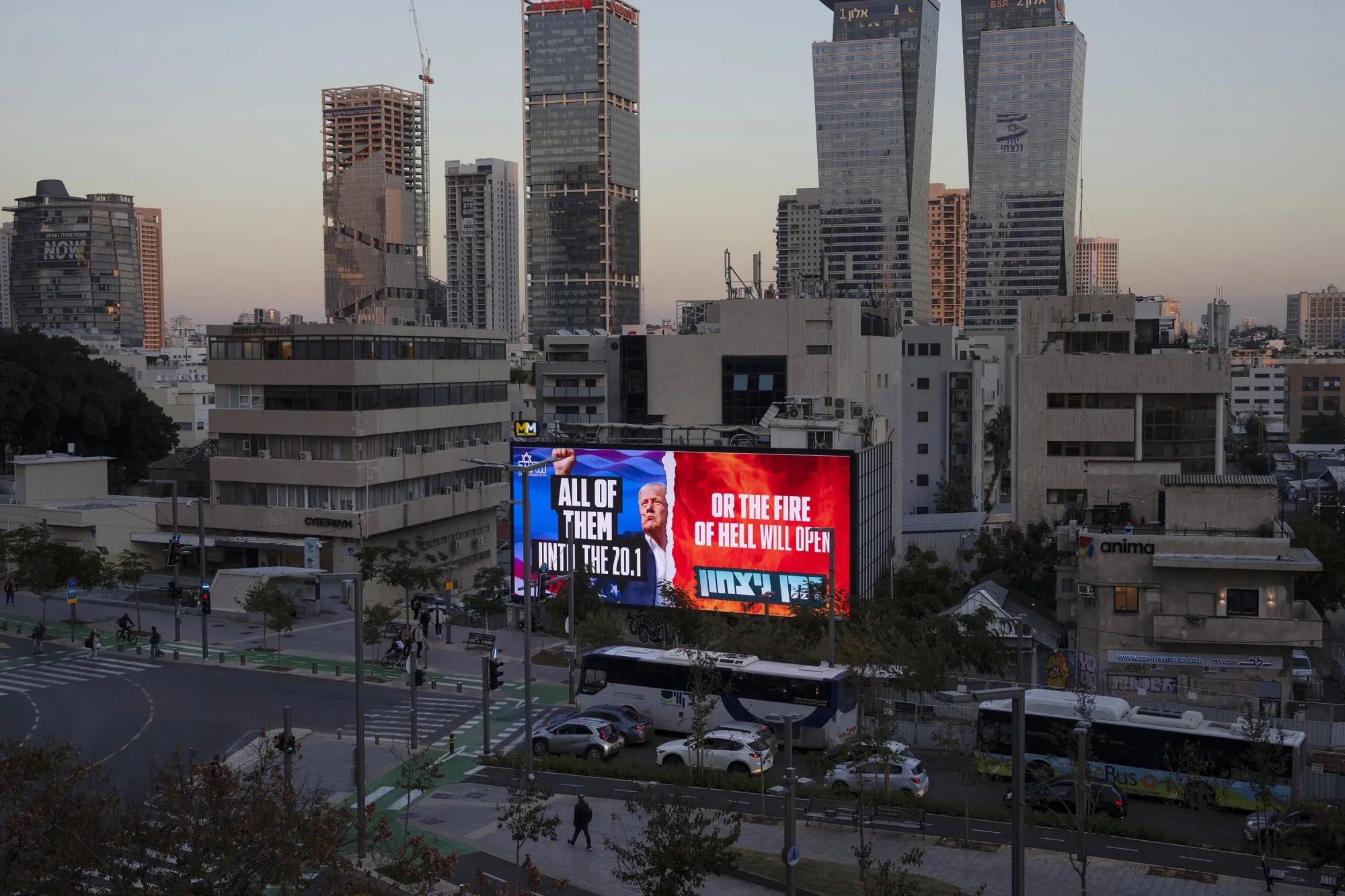 一块电子广告牌展示了当选总统唐纳德·特朗普,并提到他威胁如果在加沙的人质没有被释放,将会释放地狱的威胁,地点在特拉维夫,时间为1月8日。摄影师:奥德·巴利提/AP目前达成的共识是,最脆弱的人质——女性、病人、受伤者和老年人——将会被释放,以换取数百名巴勒斯坦囚犯。