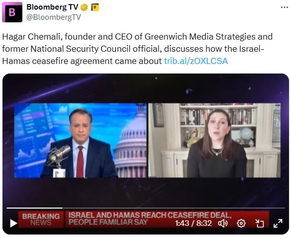 今天在彭博电视的 权力平衡早间版中,主持人乔·马修和凯莉·莱因兹采访了哈加尔·切马利,格林威治媒体策略公司的创始人兼首席执行官,以及前国家安全委员会官员,讨论以色列与哈马斯之间的停火协议。