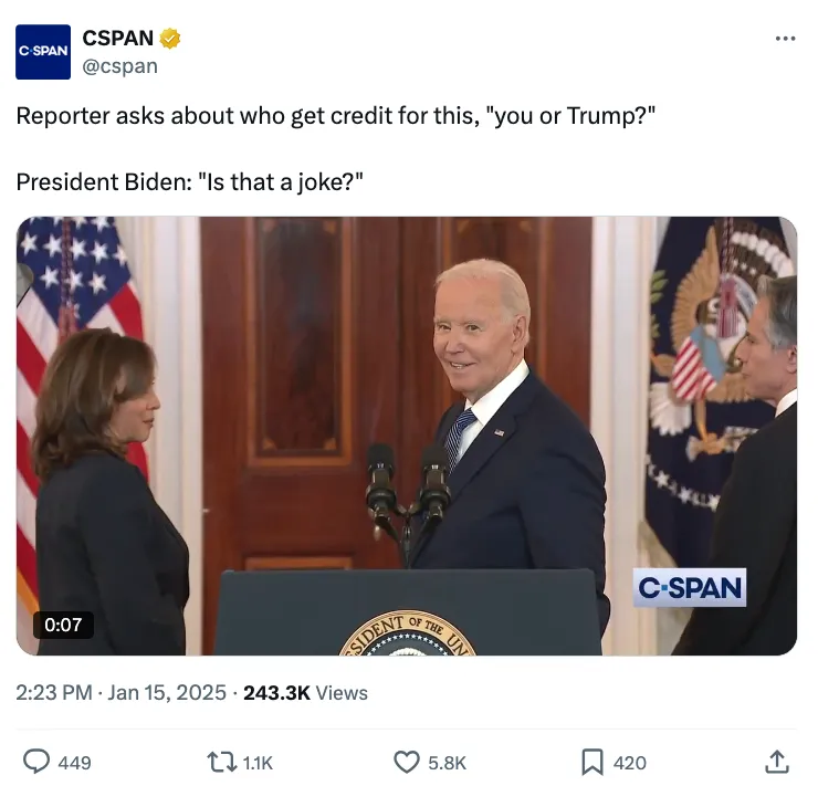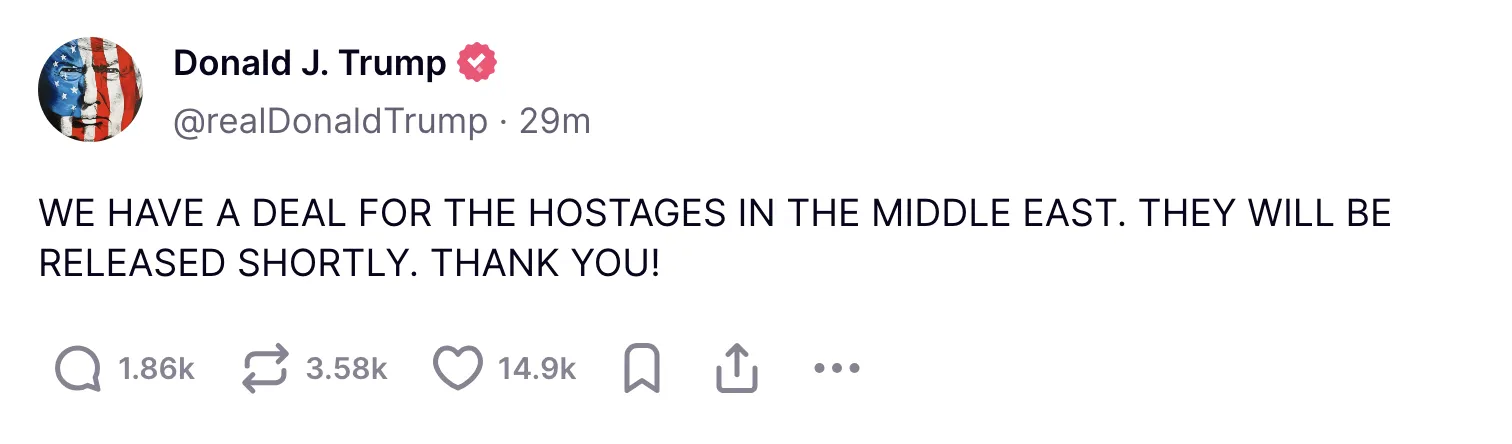 特朗普并不谦虚,今天下午在Truth Social上再次强调他的胜利:“这个史诗般的停火协议只能是我们在11月的历史性胜利的结果……我们在没有进入白宫的情况下取得了如此多的成就。”如果他继续这样下去,马克说他可能最终会获得那个诺贝尔和平奖。我们永远不会听到结束。