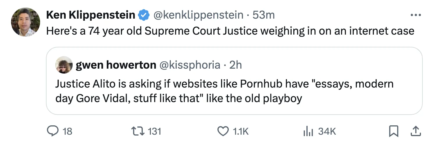如果你对为什么一位最高法院法官在谈论Pornhub和Playboy感到困惑,让我来解释一下。今天早上,法官们听取了对一项挑战德克萨斯州法律的案件的口头辩论,该法律要求性网站验证访问者的年龄。法律的支持者表示,这可以保护儿童,但成人娱乐行业的成员表示这违反了第一修正案的权利。
