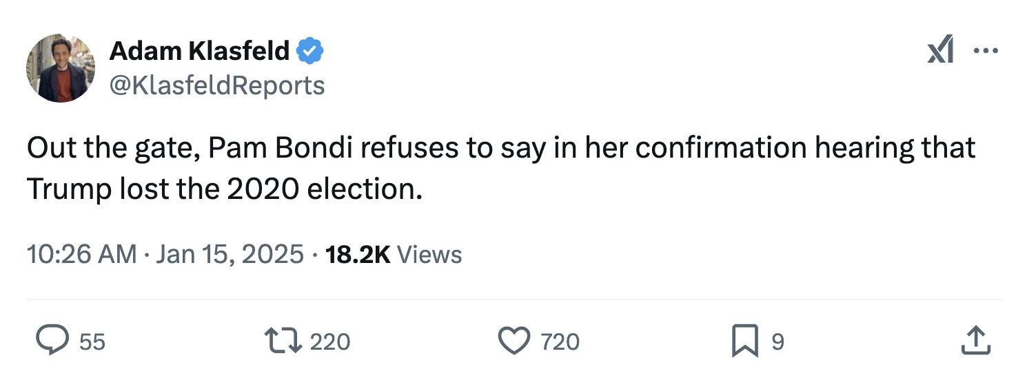 特朗普的总检察长提名人帕姆·邦迪今天处于风口浪尖。尽管埃隆·马斯克 表示她是“一个优秀的选择,”玛丽·艾伦·克拉斯质疑邦迪是否会“颠覆法治”来帮助特朗普 赦免 1月6日的暴徒,惩罚他的敌人并且 驱逐 数百万无证移民。根据听证会传出的片段,情况看起来模糊不清:尽管邦迪 向明尼苏达州参议员艾米·克洛布查承诺,如果确认,她的工作中“政治不会发挥作用”,但她 未能排除 起诉特朗普的 法律对手。