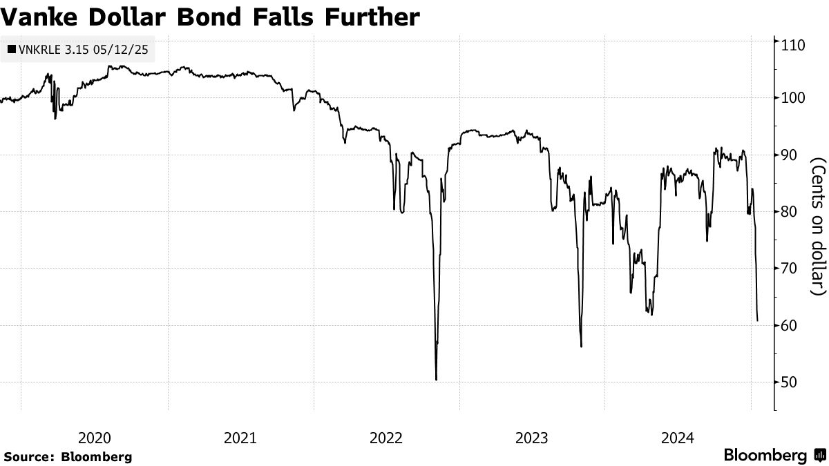 万科的3.15%美元债券于2025年到期,本周截至周四在香港下跌了16.9美分,至59.7美分,并有望创下超过一年来的最大周跌幅,依据彭博社汇编的数据。本周,万科的两只人民币债券的交易被暂停,因为每只债券的价格均下跌了20%。