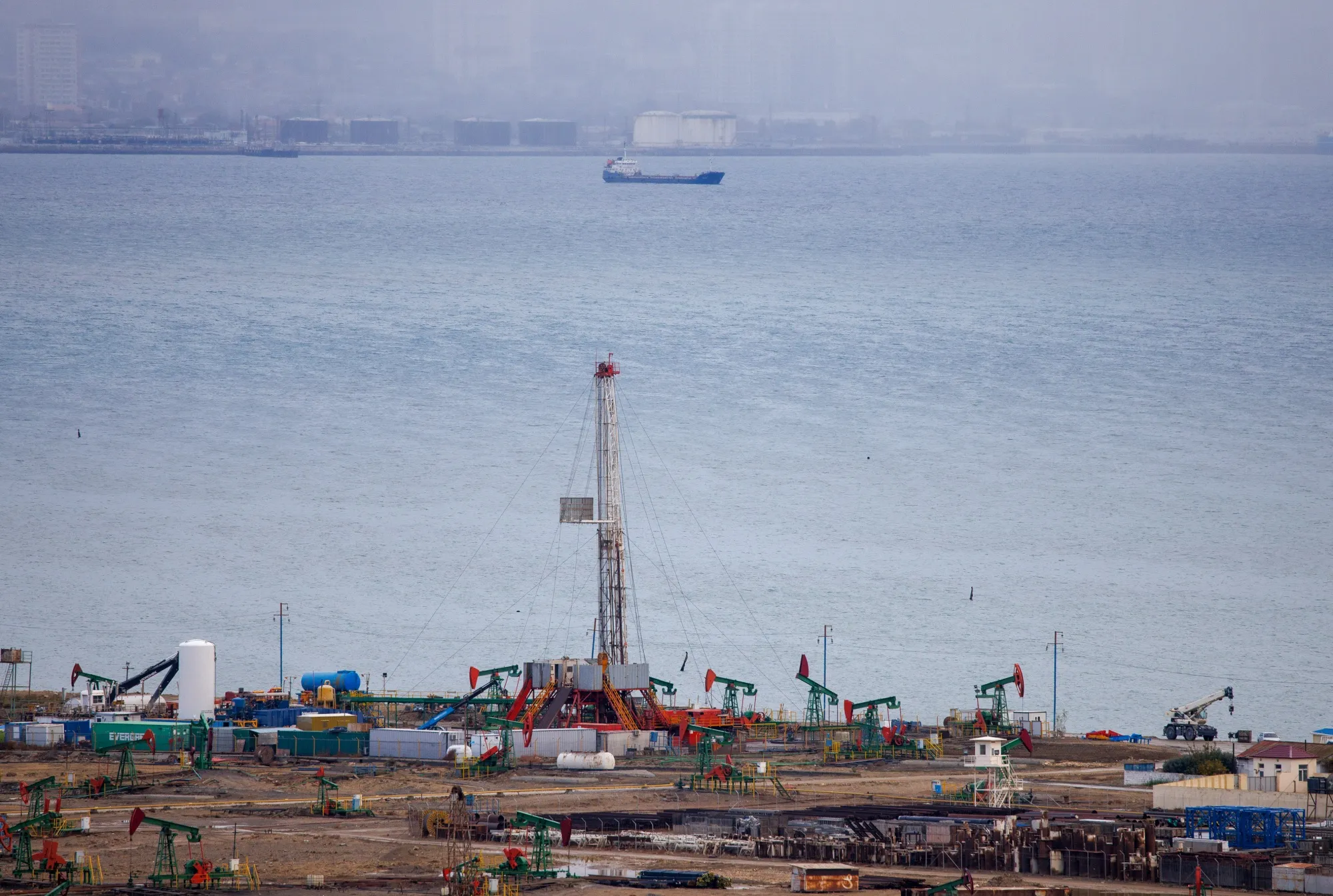 卡斯皮海附近的阿塞拜疆油田中的抽油机和钻井平台。