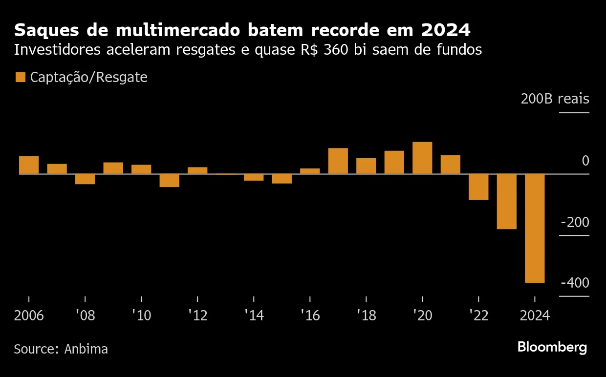 多市场基金在2024年因对利率市场的押注而遭受损失,这一年它们延续了低于CDI基准利率的表现,并见证了创纪录的资金外流。