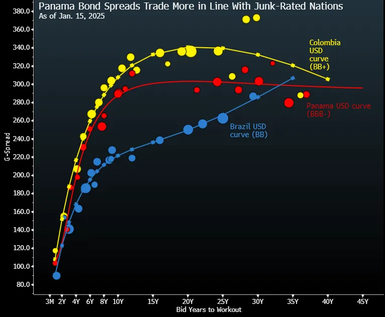 根据摩根大通的数据,自10月中旬以来,投资巴拿马美元债务的投资者遭遇了6.9%的损失,现在要求比BB评级主权证券的平均风险溢价高出50个基点以上的额外收益来持有其债券。