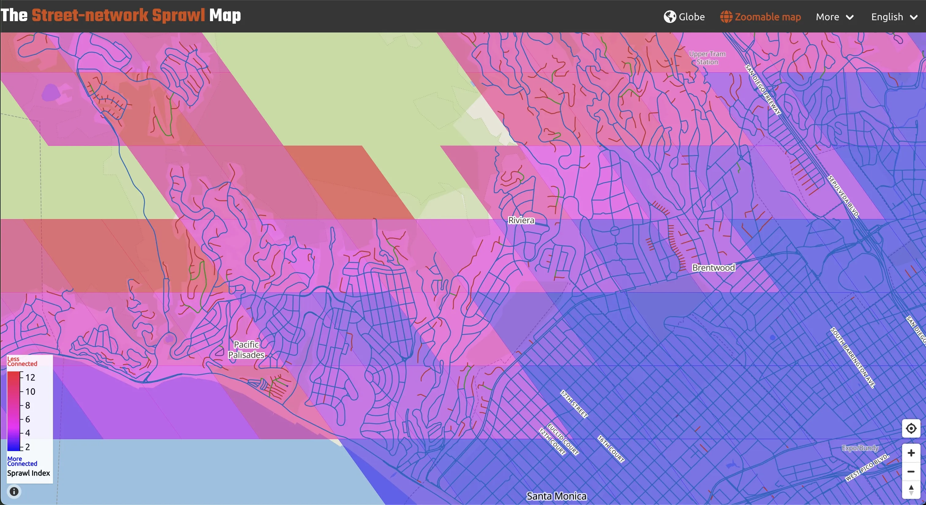 米拉德-巴尔的最新研究 绘制了全球街道网络扩张的传播图 — 想象一下以死胡同、环形路和死路为主的社区,与纽约市的网格状模式相比。在他的地图中,太平洋帕利塞德斯的部分地区 — 包括火灾开始附近的帕利塞德斯高地社区 — 被涂成粉红色,表示连接性得分较低。在这些地区,出行路线较少,当大量居民试图同时逃离时,容易造成拥堵。
