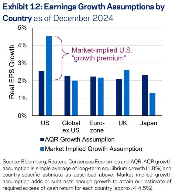 后者帮助经典的60/40投资策略在2024年实现了两位数的收益,但使得股票看起来价格昂贵。由于股票的预期回报保持相对稳定,这意味着“AQR写道,2025年初将是一个风险溢价压缩的世界。”这在美国尤其如此。