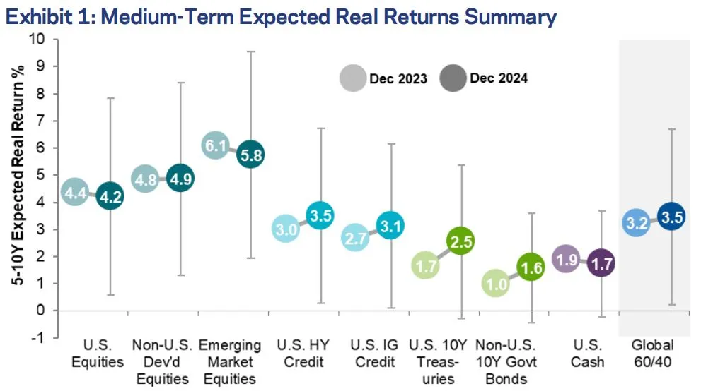 这家管理着1140亿美元资金的公司现在预计,全球60/40策略的实际回报——将投资组合分为60%的股票和40%的债券——在未来五到十年将达到3.5%,高于之前的3.2%的预测。