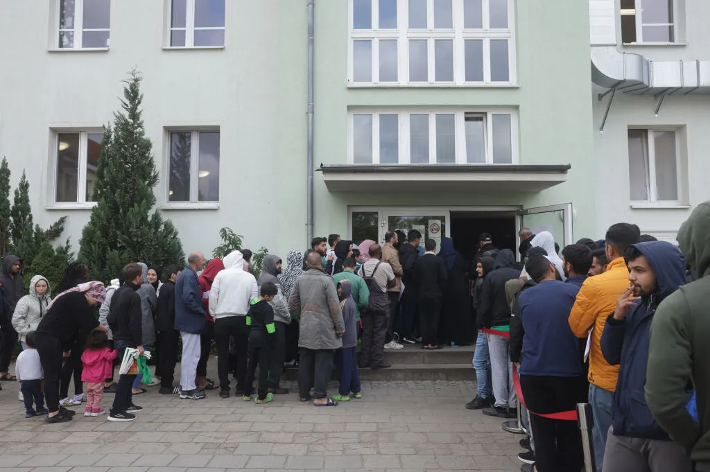人们在德国艾森哈滕施塔特的移民和难民初始接待设施排队等候午餐。摄影师:肖恩·加卢普/盖蒂图片社欧洲### 社会政策