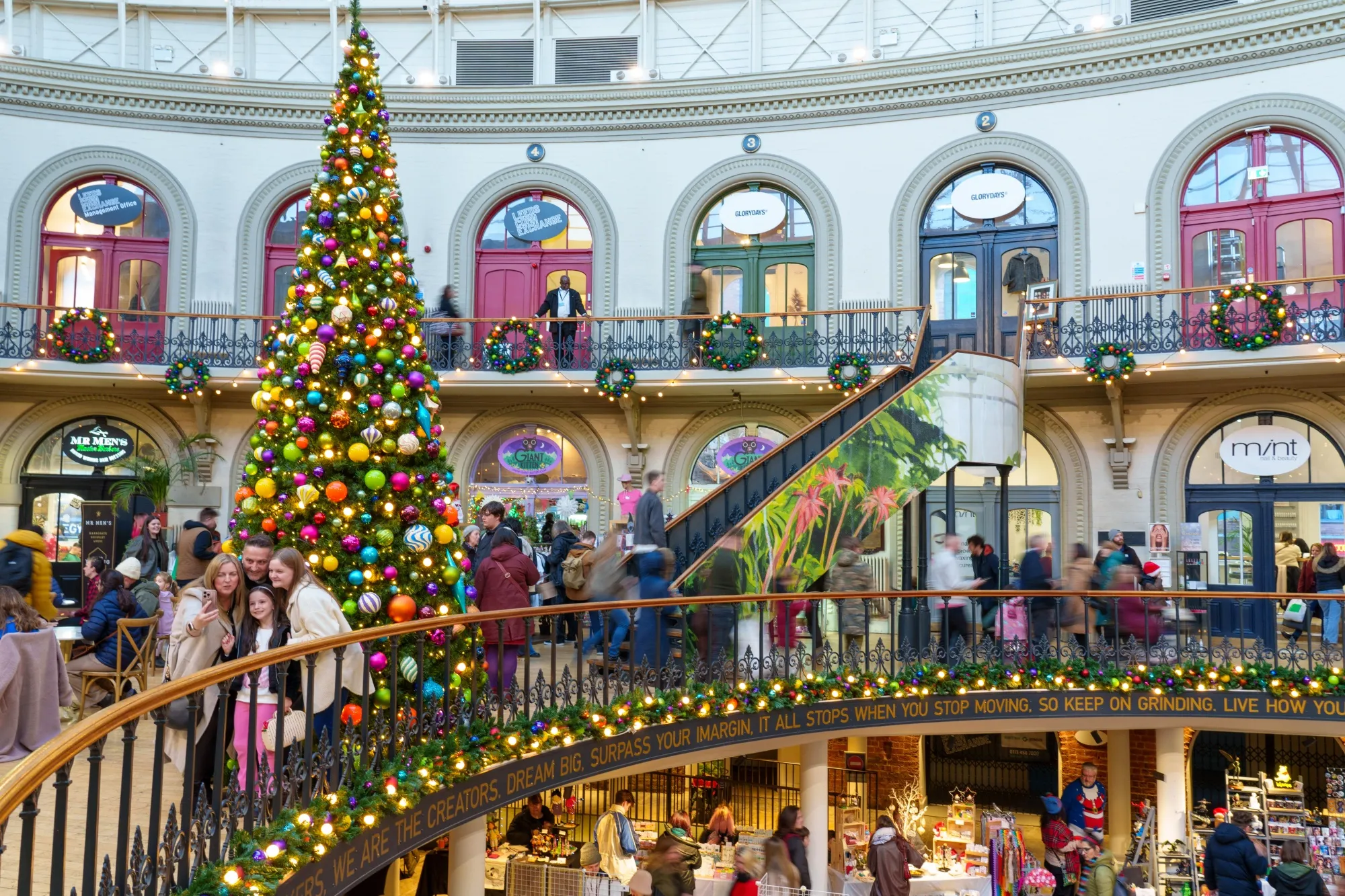 英国利兹的利兹玉米交易所的购物者,日期为12月21日。