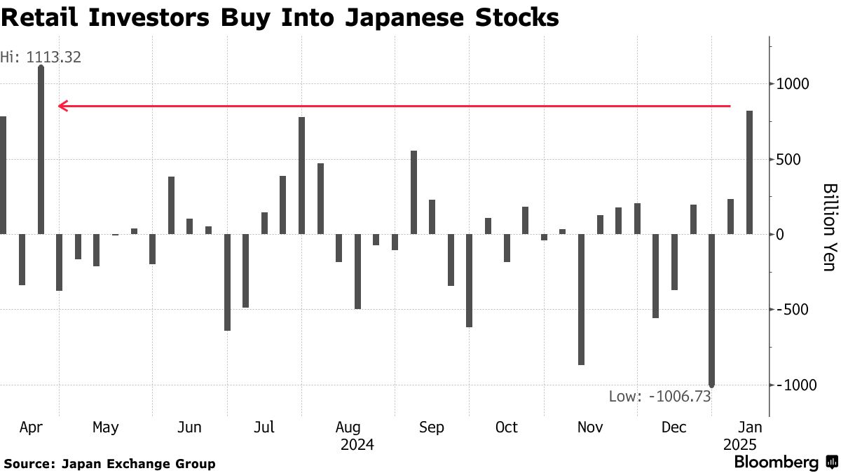 尽管日本基准股指下跌约2%,以及唐纳德·特朗普即将重返白宫带来的不确定性,零售投资者在截至1月10日的一周内购买了合计 8193亿日元(53亿美元)的现金和期货。这是自2024年4月以来的最高水平,数据来自日本交易所集团。