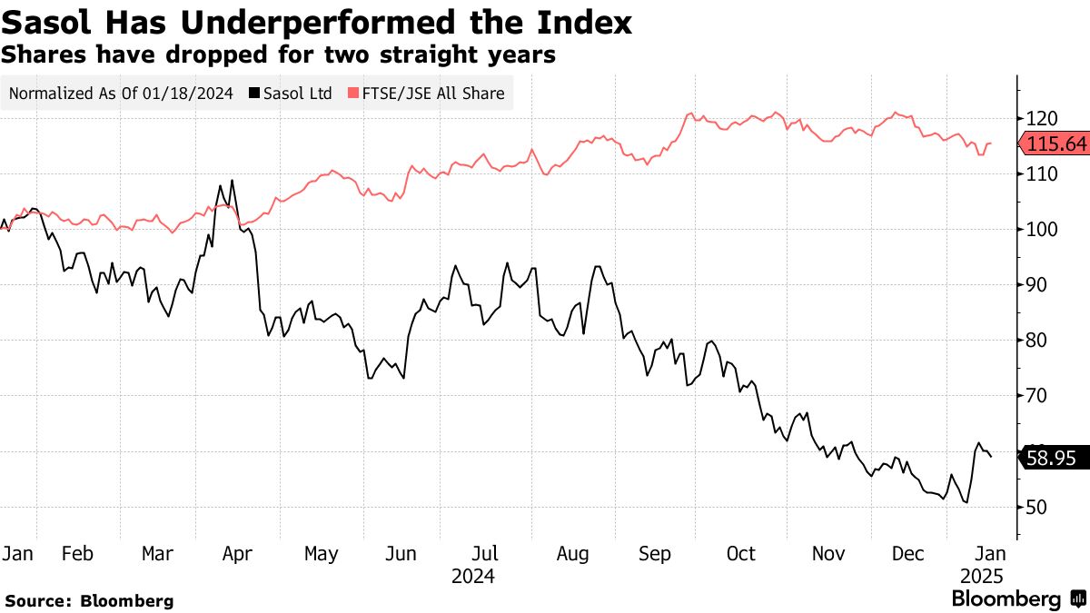 该公司的股票在约翰内斯堡上涨了多达10.5%,是自6月18日以来的最大涨幅。这家南非煤炭燃料和化学品制造商去年报告了自2020年以来的首次亏损,并进行了数十亿美元的减值。该公司约有40亿美元的债务,并暂停了股息支付。其股票在2024年暴跌了55%。