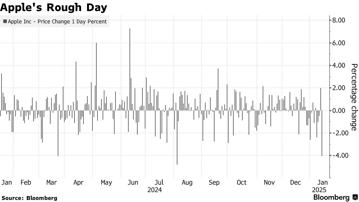 苹果公司周四下跌4%,这是自八月以来iPhone制造商最大的一天百分比跌幅。由于对iPhone销售和关键中国市场疲软的担忧,股票在2025年承压。面临压力。与纳斯达克100指数上涨0.4%相比,苹果今年下跌近9%。