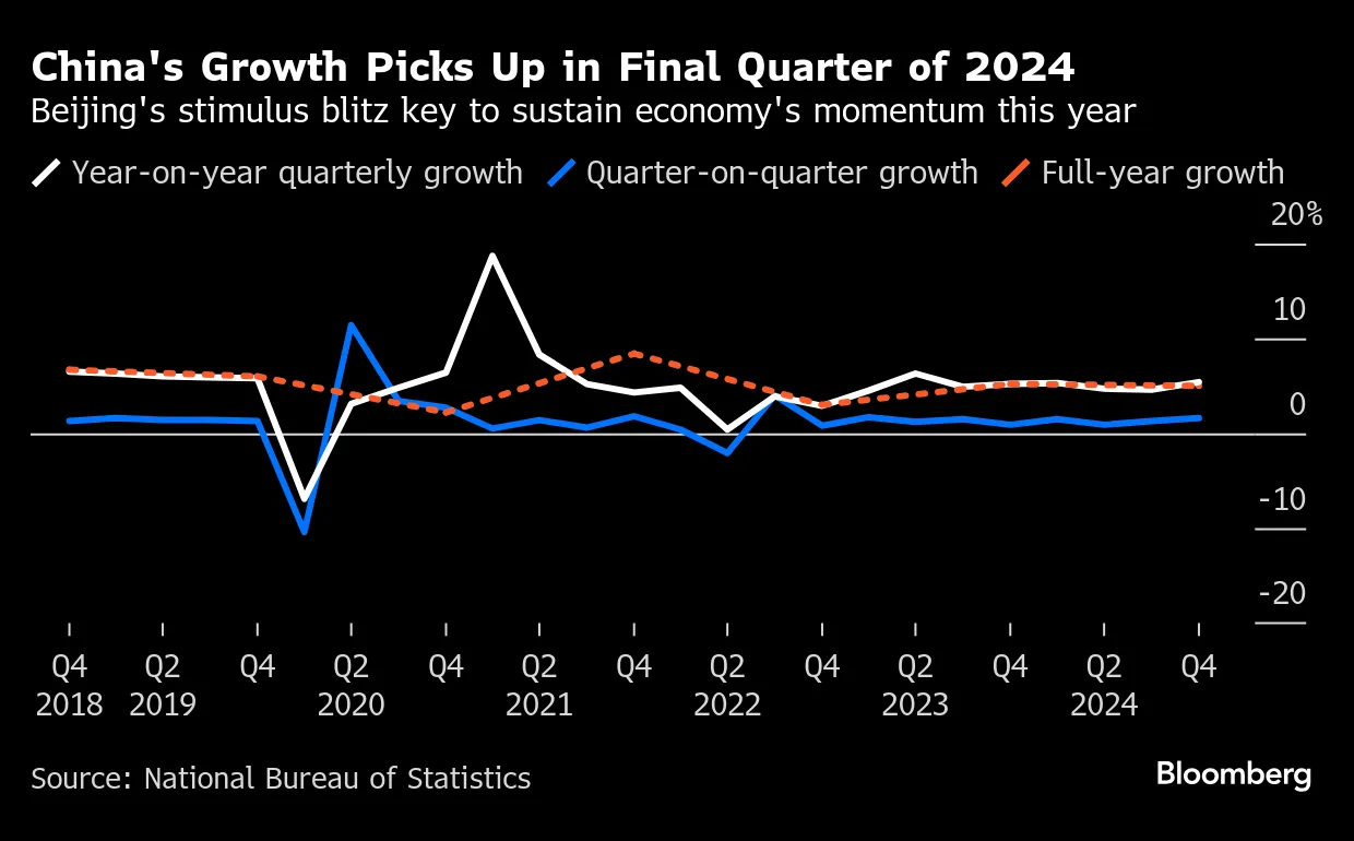 国内生产总值在过去三个月同比增长5.4%,超出了大多数分析师的预期,标志着六个季度以来的最快增速。这一跃升使得年度增长达到5%,确认了中国领导人在新年前夕宣布的预估。