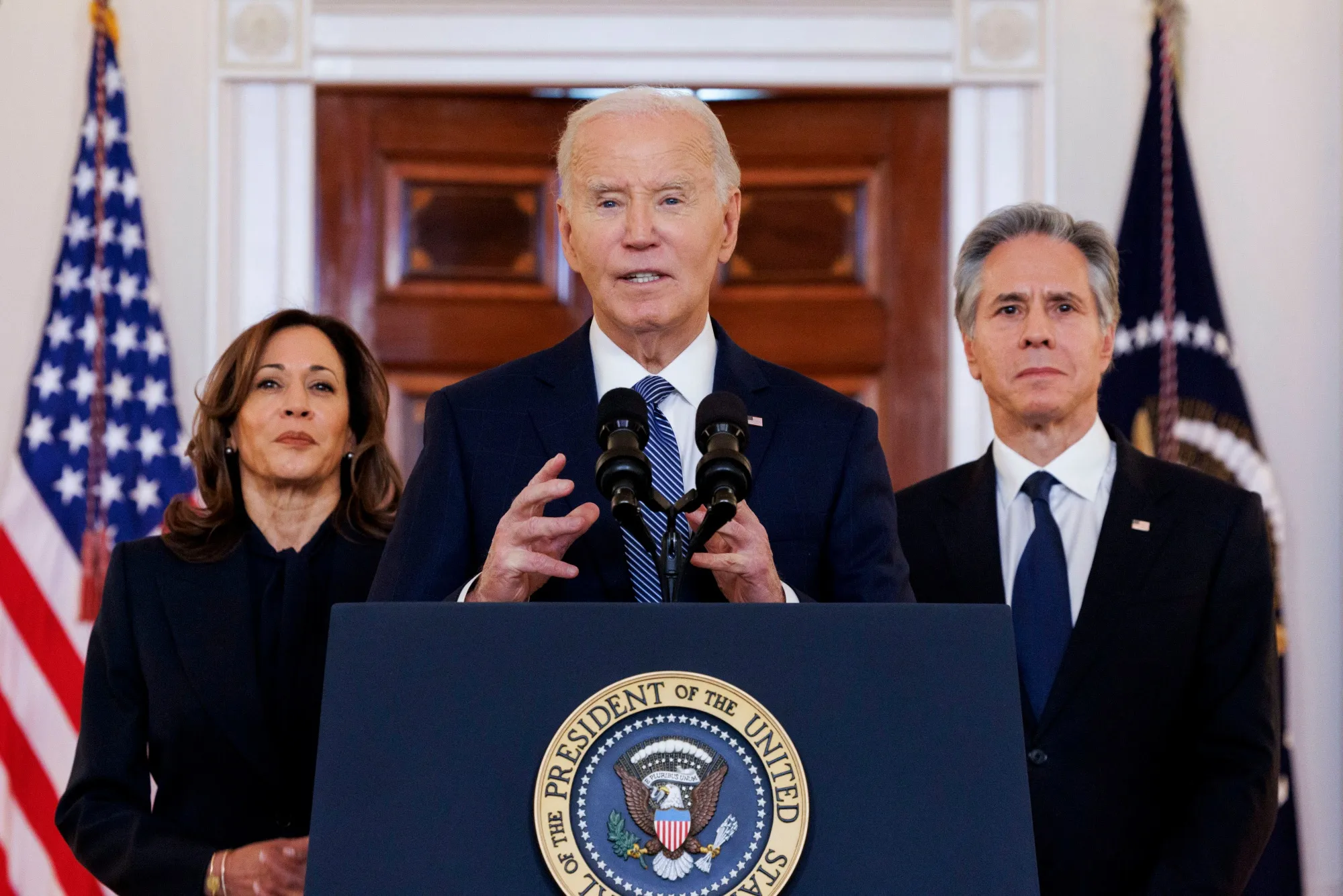 乔·拜登在白宫的交叉大厅谈论以色列和哈马斯之间的停火协议,时间是1月15日。摄影师:亚伦·施瓦茨/Sipa/Bloomberg然而,在以色列内部,许多人持谨慎态度,许多政治家表示,战争必须继续,直到哈马斯被彻底摧毁。
