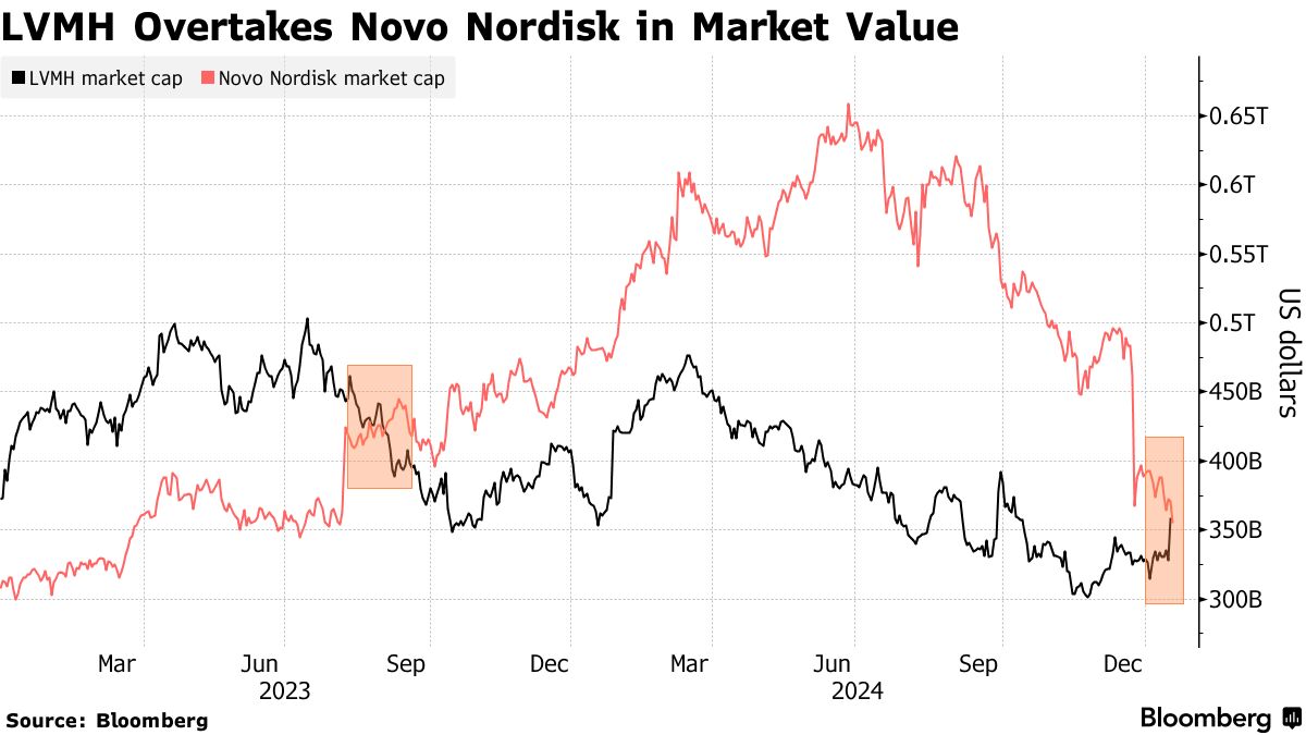 这家丹麦制药公司的股票在周五下跌了超过4%,因为其畅销药物Ozempic和Wegovy成为最新被 针对的药物,导致诺和诺德的市值约为3550亿美元,并首次低于这家法国奢侈品制造商,自2023年9月以来。路易威登集团下跌了0.3%,市值为3570亿美元。
