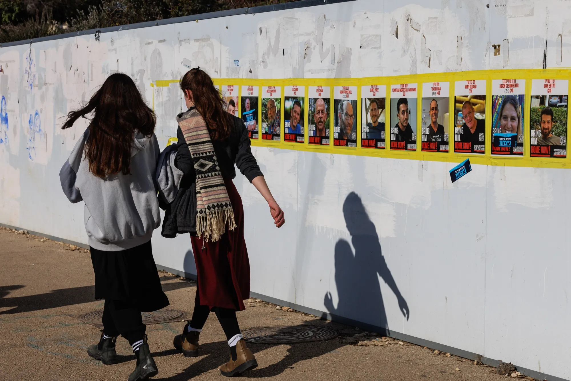 在耶路撒冷的一面墙上,展示了被哈马斯扣押的以色列人质的海报。