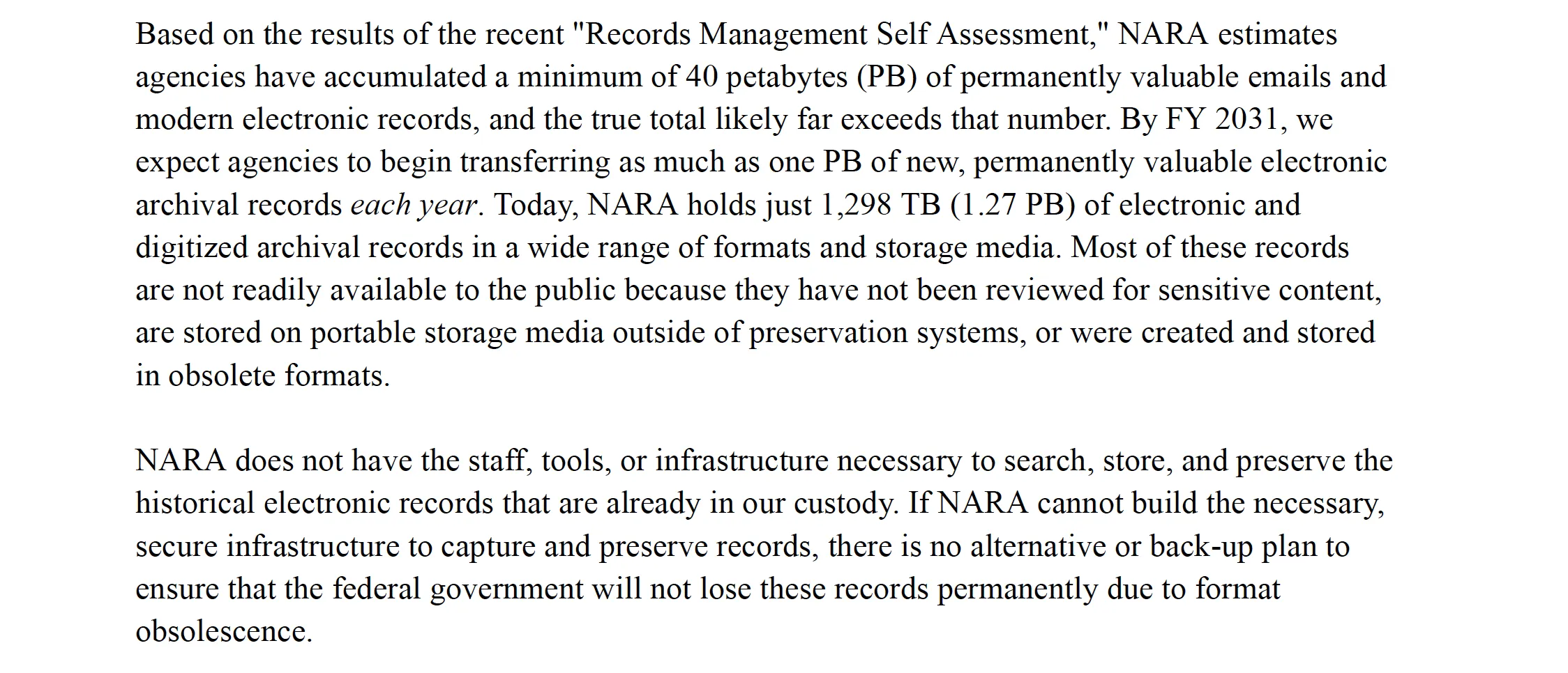 “维护一系列建筑、信息技术基础设施以及必要的人员,以保存并提供公众访问超过130亿页的模拟(或纸质)记录,对NARA来说是一项艰巨的任务,”该机构的过渡简报书中写道。“如果NARA无法建立必要的安全基础设施来捕捉和保存记录,就没有替代方案或备份计划来确保联邦政府不会因格式过时而永久丢失这些记录。”