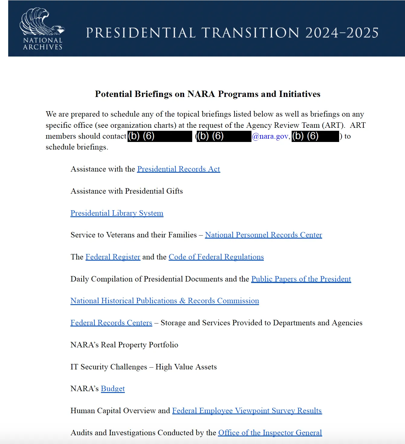 摄影师:斯特凡妮·雷诺兹/彭博社 快乐的FOIA星期五。距离唐纳德·特朗普的总统就职典礼和他第二届政府的开始只有三天。在11月的选举后,我向数十个联邦机构提交了FOIA请求,要求他们提供为即将上任的政府准备的总统过渡简报材料,这是所有机构的法定义务。在FOIA文件在假期期间暂停之前,国家档案和记录管理局(NARA)向我发送了它的总统过渡简报书。当我本周阅读这73页内容时,我开始思考:NARA是特朗普报复目标中最脆弱的政府机构之一。如果你还没有在收件箱中收到FOIA文件,请在这里注册。