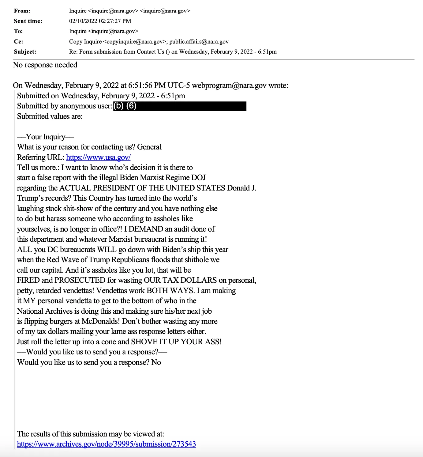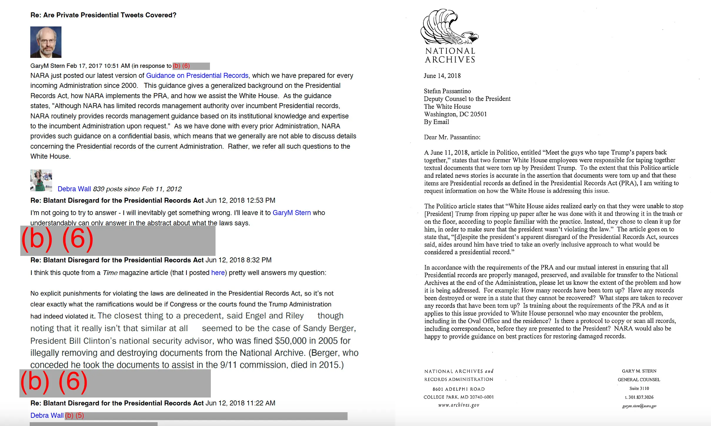 几年前,NARA给我发送了其 内部通信,与《政治报》的独家报道有关。这些电子邮件和聊天记录部分被编辑掉了。但这仍然是关于该机构如何回应针对特朗普的指控的相当不错的阅读,基本上是“你需要更多培训吗?”