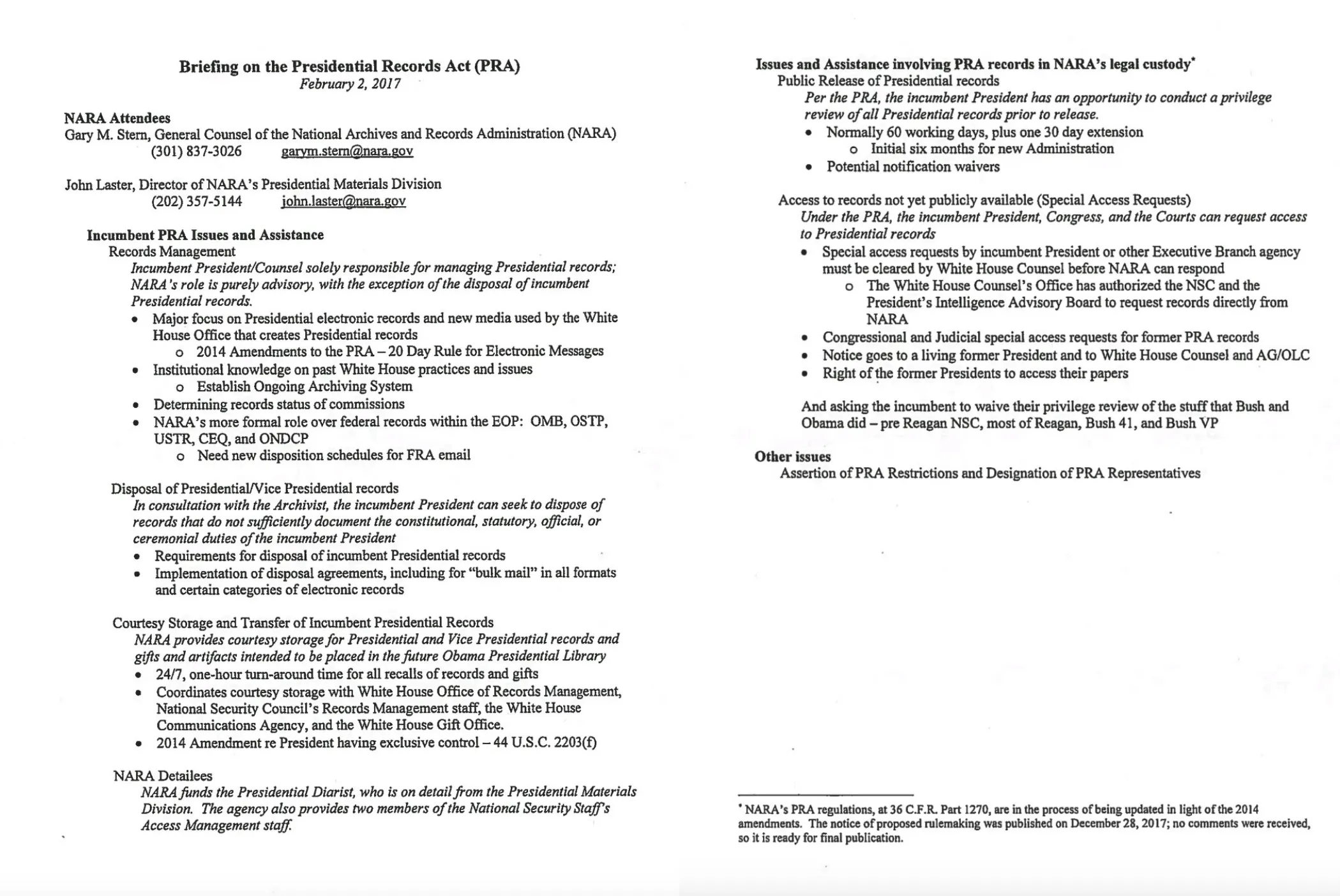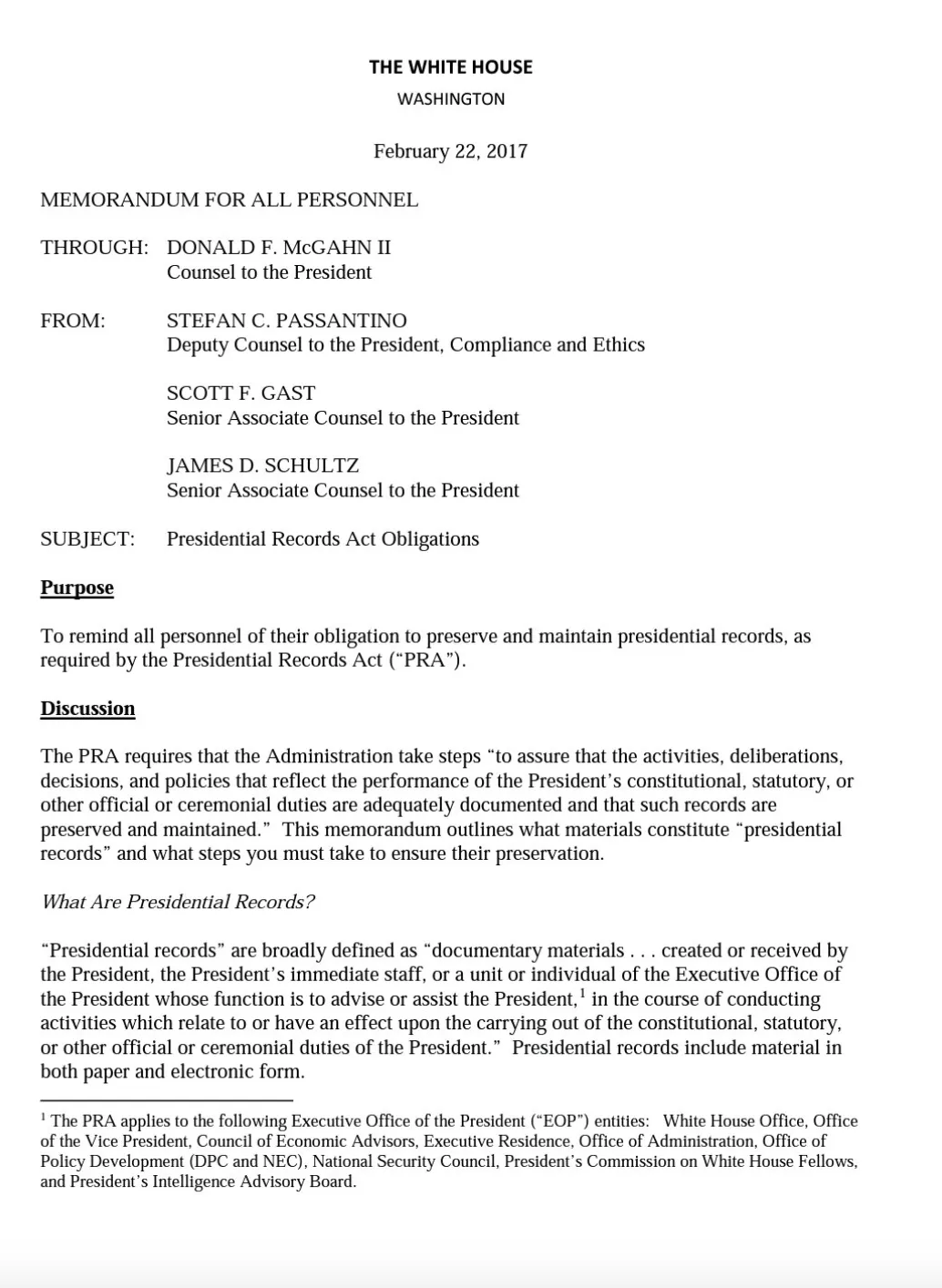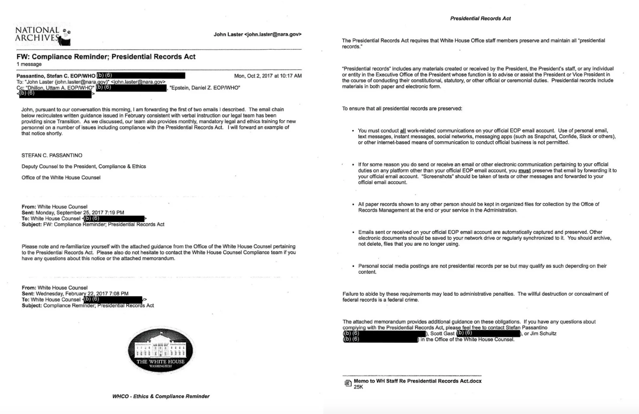 2017年2月2日NARA为特朗普白宫举行的简报议程三周后,白宫合规与伦理顾问Stefan Passantino 发出了一份备忘录,提醒特朗普白宫的律师和其他人员“根据总统档案法的要求,保留和维护记录的义务。”