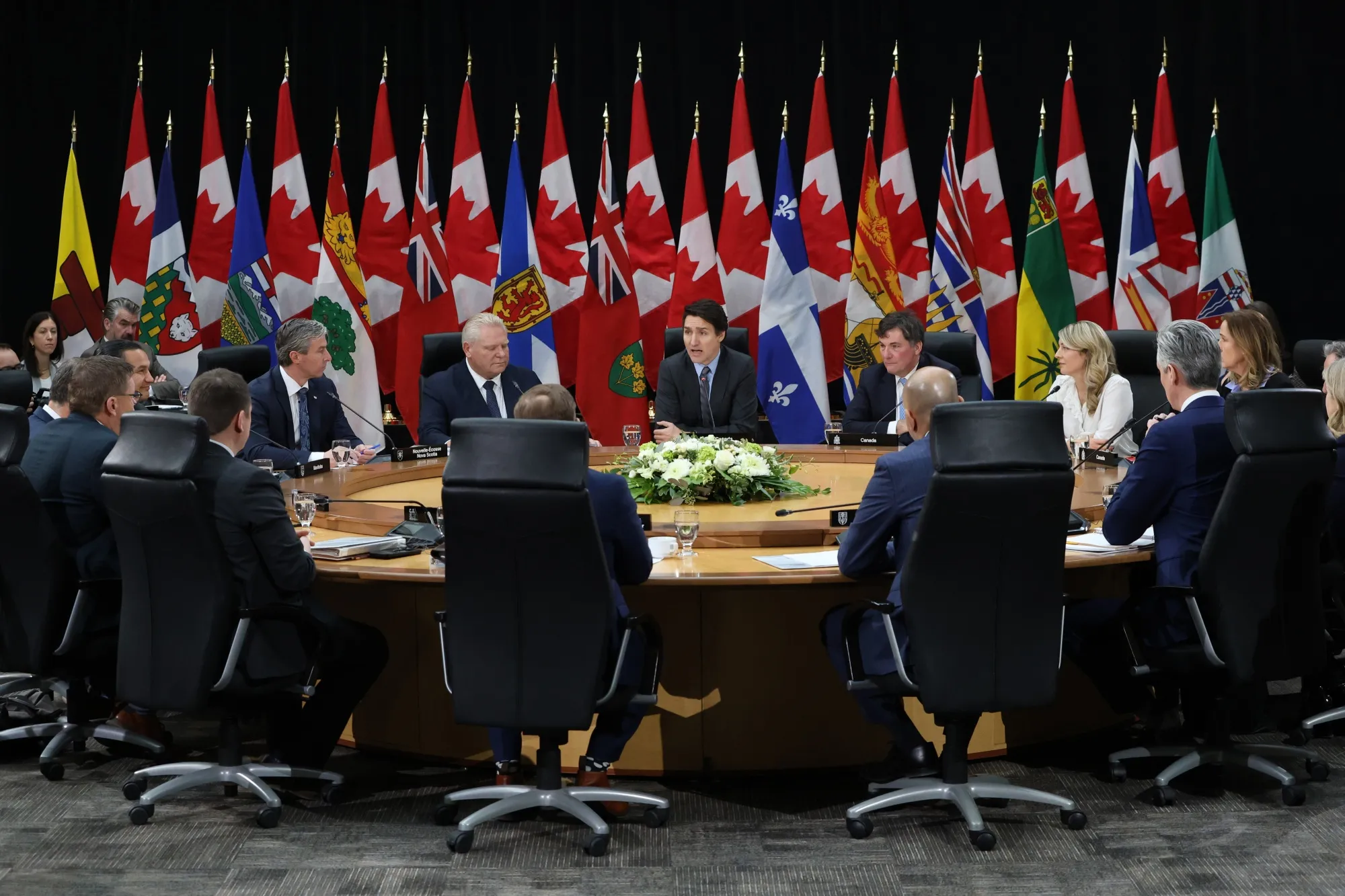 贾斯廷·特鲁多(Justin Trudeau),中间,周三在渥太华召集加拿大的省长们,讨论对美国关税威胁的统一回应。