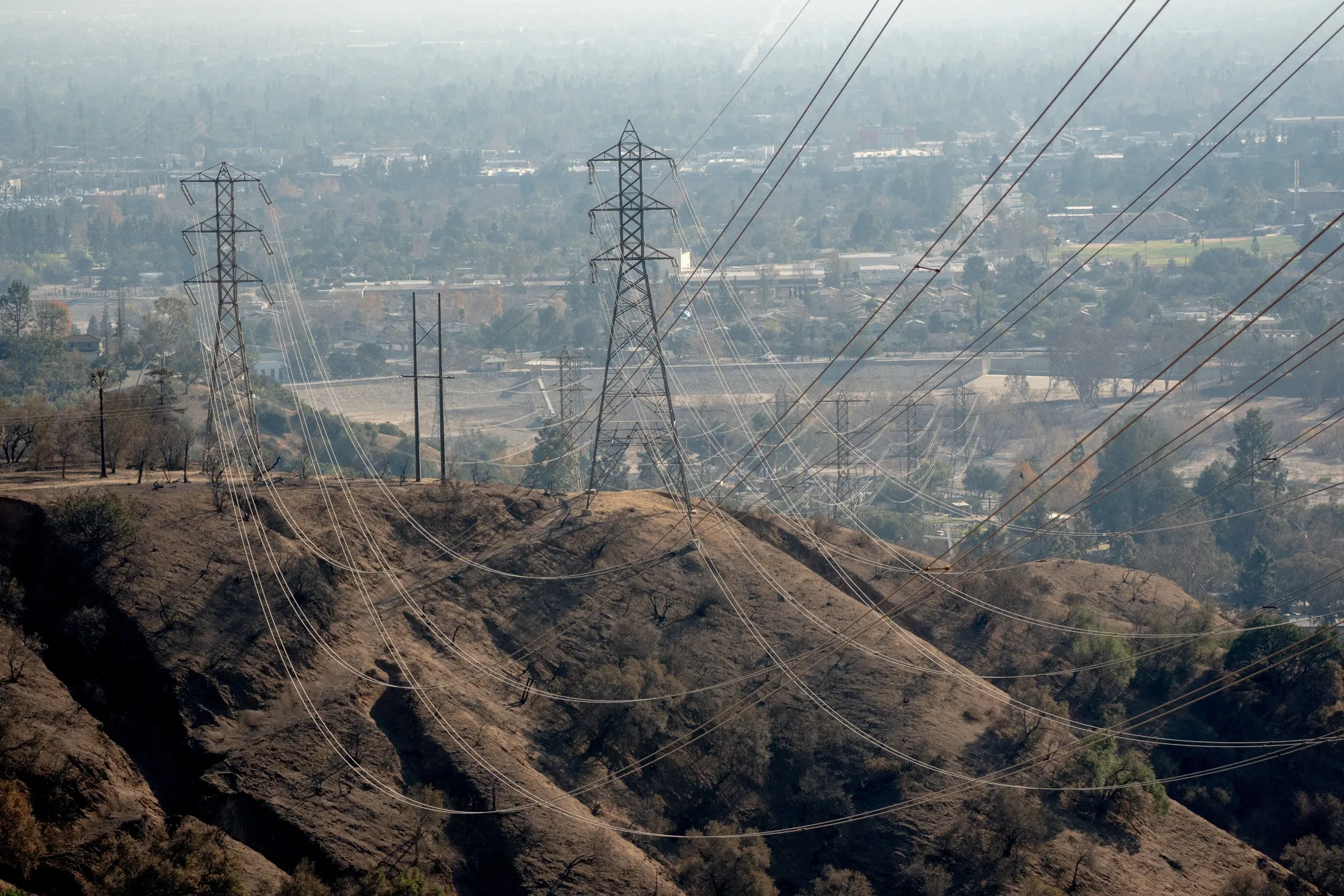 加利福尼亚州帕萨迪纳市伊顿峡谷的南加州爱迪生公司电力传输线路,拍摄于1月16日的伊顿火灾后。