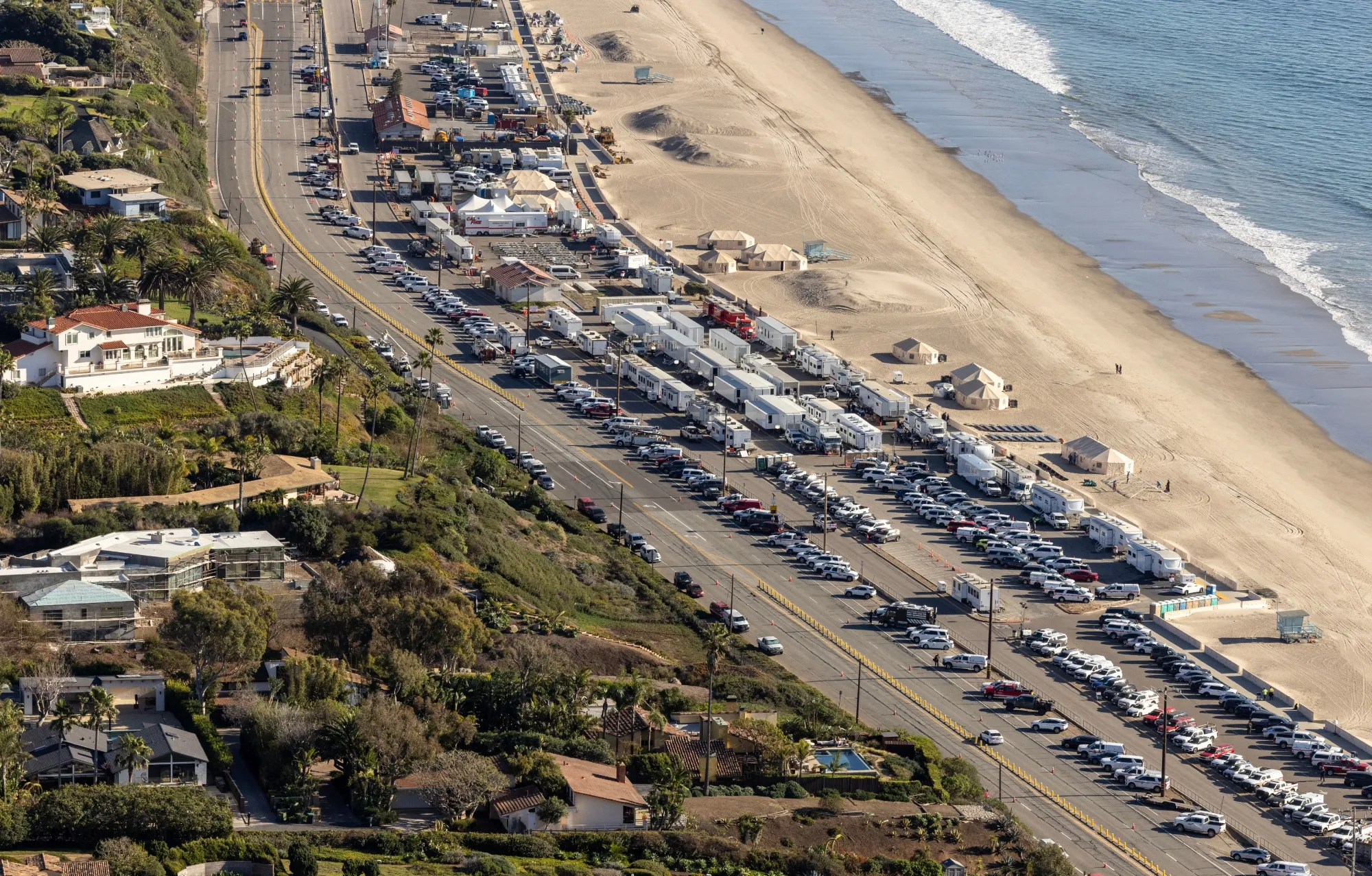 马里布的祖玛海滩停车场被改造成了帕利塞德火灾第一响应者的指挥中心。摄影师:吉尔·康奈利/彭博社