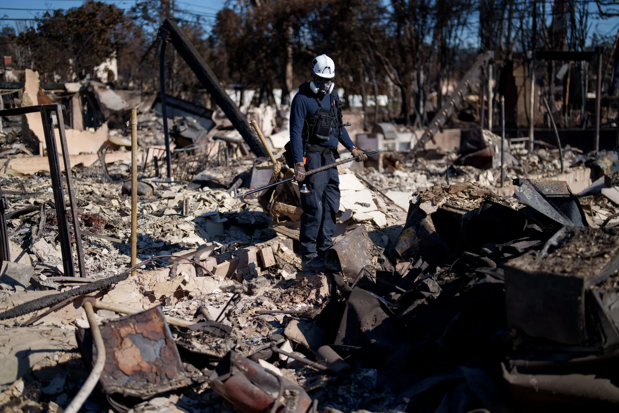 一名消防员在阿尔塔迪纳的伊顿火灾后检查一处被烧毁的房屋。大约8000栋建筑在火灾中被摧毁或损坏。摄影师:凯尔·格里洛特/彭博社