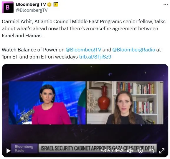 今天在彭博电视的 权力平衡 早间版中,主持人乔·马修和凯莉·莱因兹采访了大西洋理事会中东项目高级研究员卡米尔·阿比特,讨论以色列与哈马斯之间停火协议的下一步。