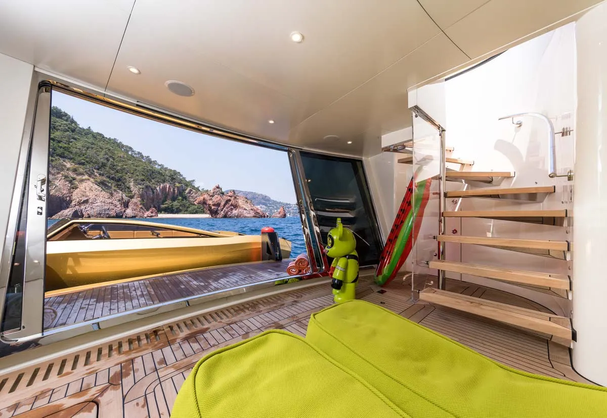 户外生活空间也很宽敞。这11个人可以享受在日光甲板热水浴缸中浸泡,或在水边游泳平台上放松,平台有台阶直接通向大海。早晨的咖啡可以在上层甲板的宽敞座位区享用,旁边还有真人大小的泰迪熊雕像陪伴。尽管游艇以25节(29英里每小时)的速度飞驰,但日光甲板上的两个猩红色驾驶椅提供了迎风而行的最佳位置。