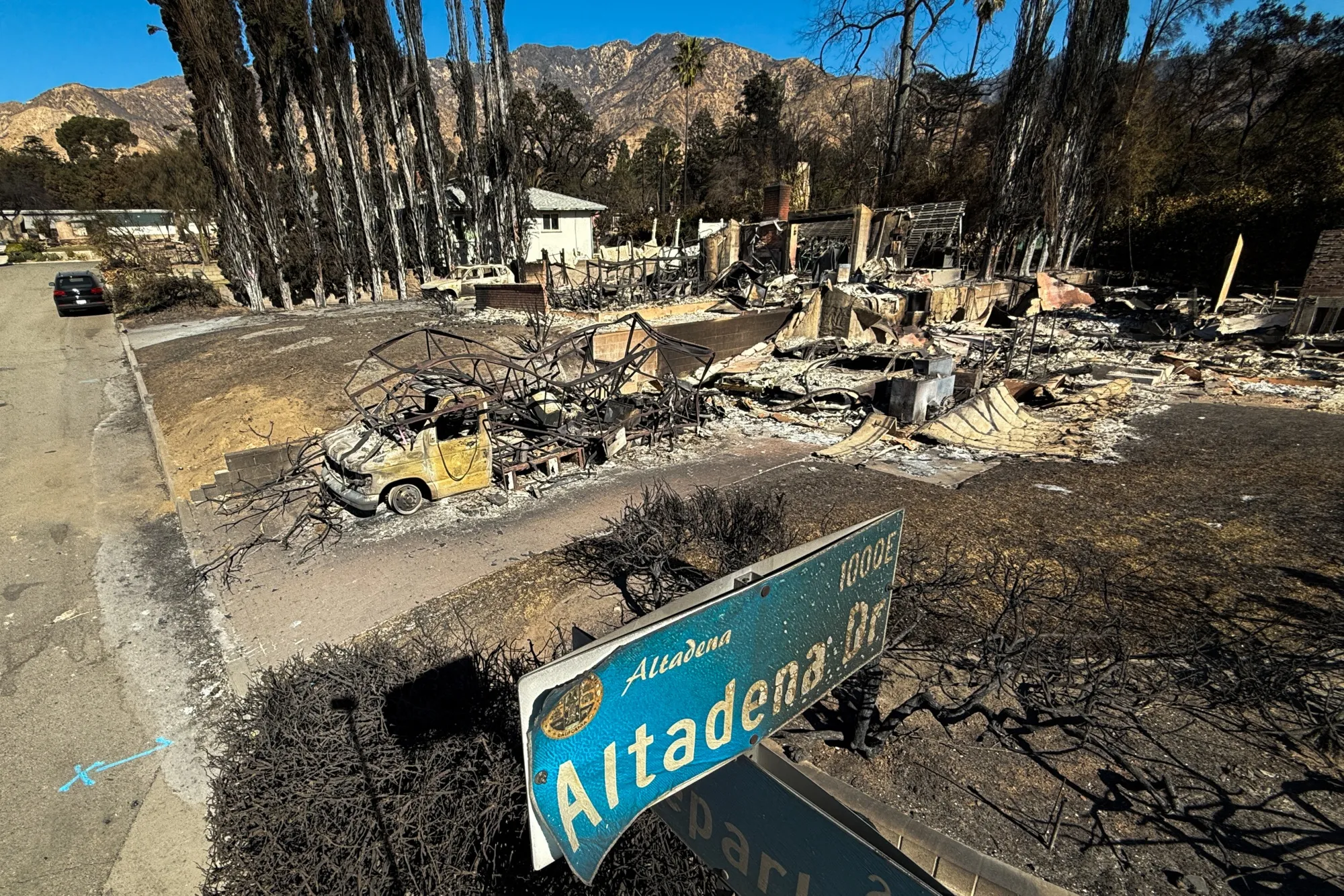 阿尔塔迪纳的房主布莱恩·麦克马洪(左)和艾米莉·菲利普斯(右)在2025年1月13日查看他们房子的残骸。