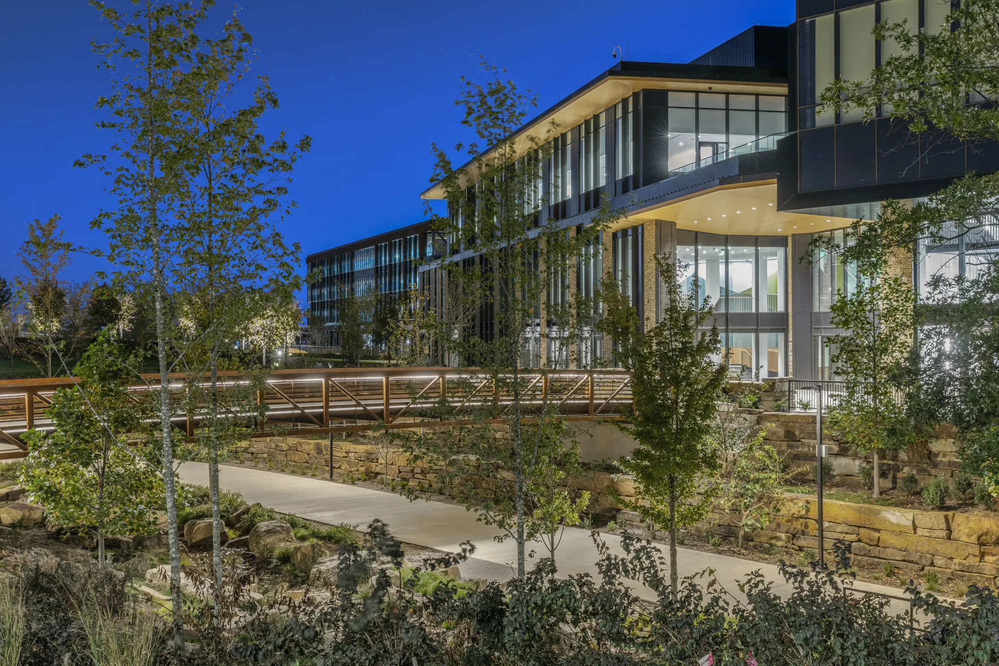 用当地石材建造的露天剧场,周围环绕着山茱萸树,以纪念慈善家海伦·沃尔顿。沃尔玛提供在Gensler的总体规划下,由米勒·博斯库斯·拉克建筑师事务所、SWA等设计,新总部几乎是一个城市中的城市。园区拥有6.7英里的街道、人行道、小径和小路,特别设计以促进自行车通勤者。由SWA设计的景观总面积达到115英亩的阿肯色州本土生态系统。一个新的360,000平方英尺的健身设施比附近的水晶桥艺术博物馆(即使在其扩展之后)还要大。
