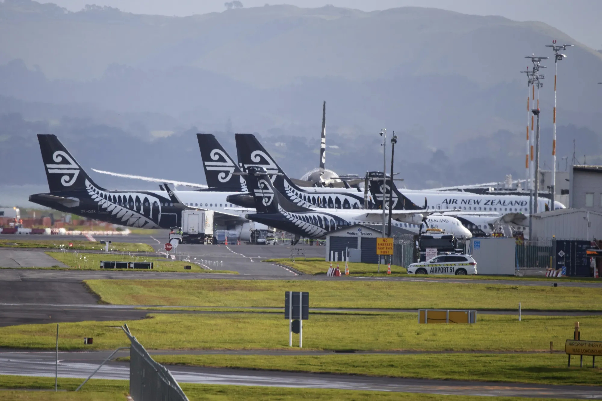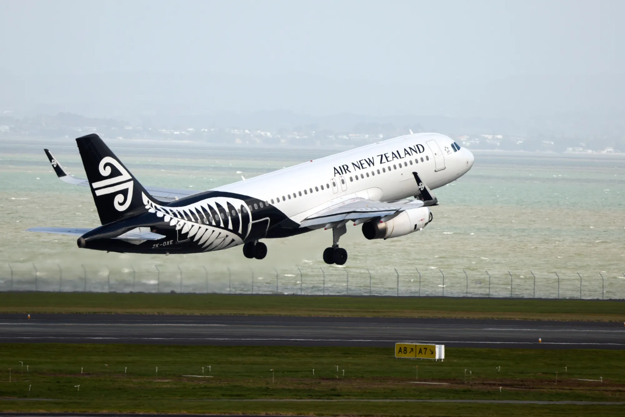 新西兰航空的一架飞机在新西兰奥克兰机场起飞。
